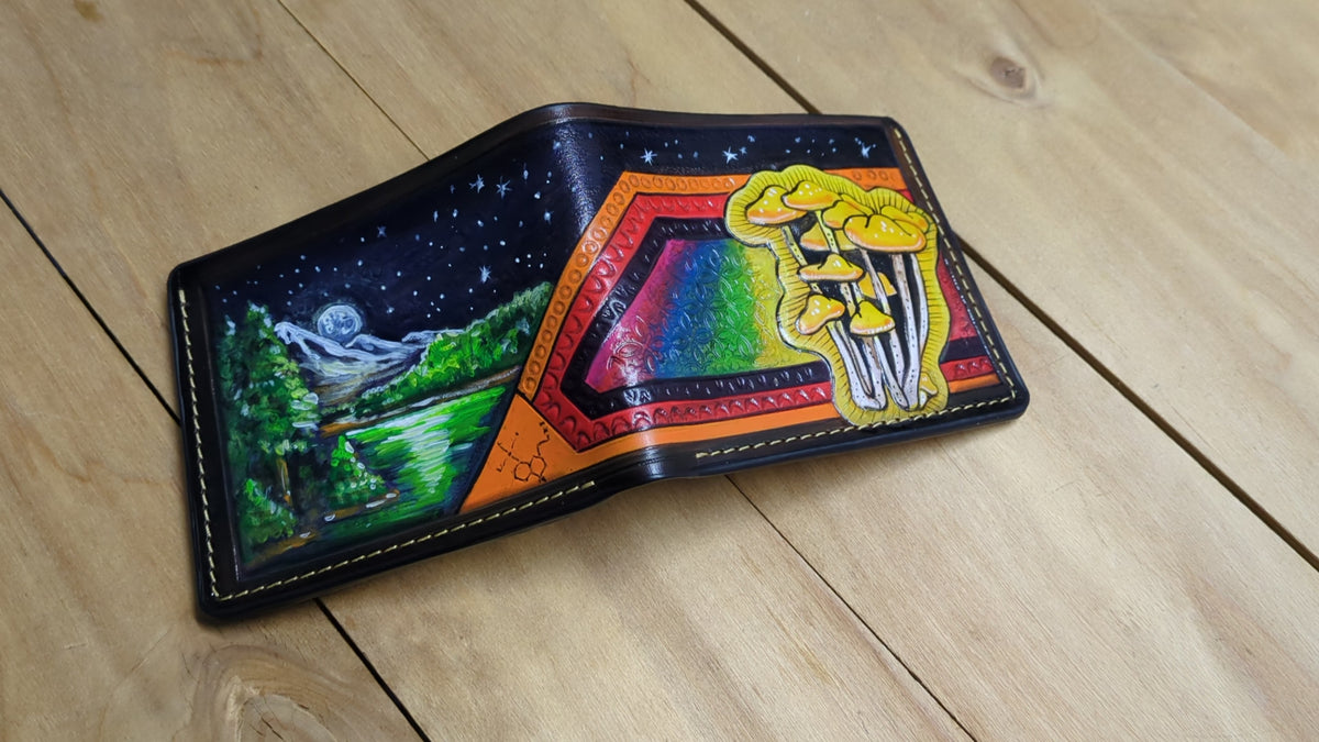 Handmade bifold leather wallet featuring a vibrant magic mushroom design inspired by Psilocybe Azurescens and rainbow shrooms, set against enchanting moonlit mountains. With detailed embossing and elements of fantasy art, this wallet is perfect for mushroom enthusiasts and nature lovers. Designed as a functional biker wallet, it offers spacious compartments while maintaining a stylish, plant-inspired aesthetic. An ideal gift for him, fans of unique artistry, and those who appreciate the magic of the natural world.