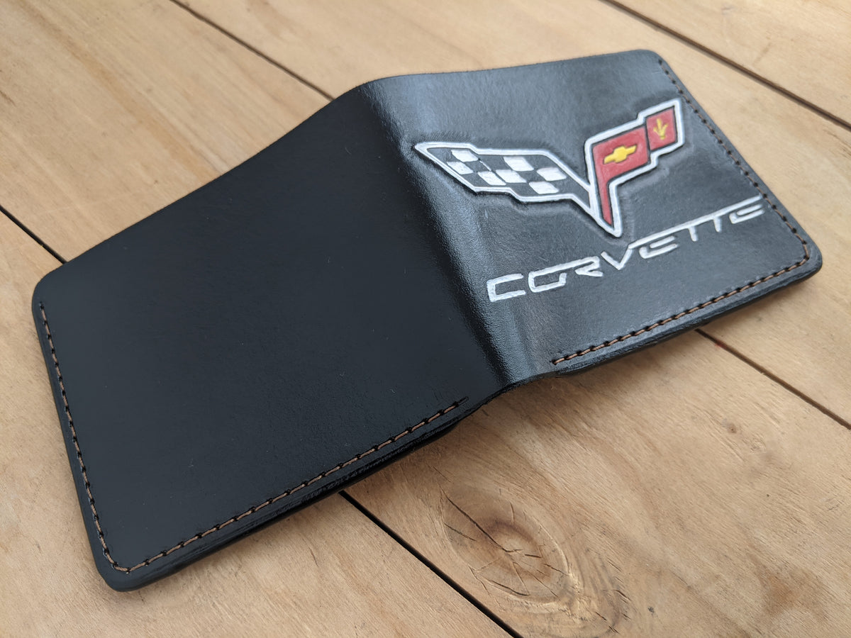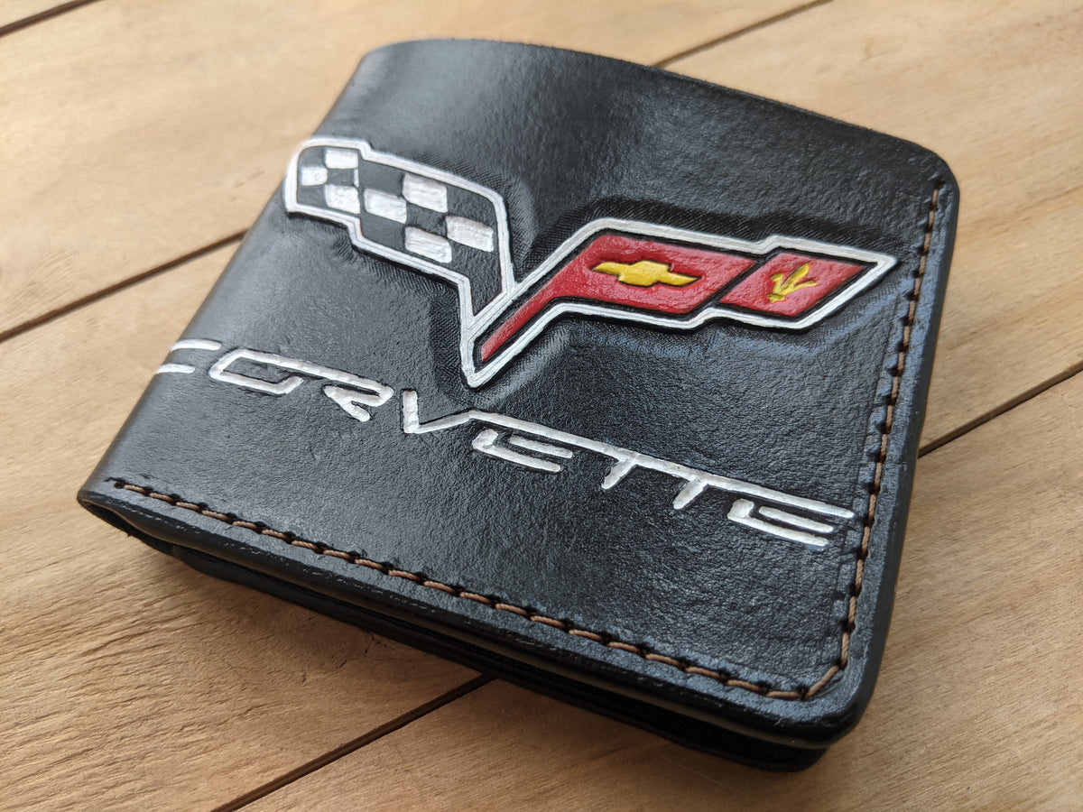 Celebrate the legacy of Chevrolet Corvette with this handmade embossed bifold leather wallet. Featuring the iconic Corvette crossed flag logo, this premium leather wallet is crafted from high-quality materials and offers RFID protection for security. A perfect gift for Corvette enthusiasts, sports car lovers, and Chevy fans. Whether it's a C2, C6, or C8 fan, this wallet makes an excellent Corvette gift for him on birthdays, Valentine's Day, or any special occasion.