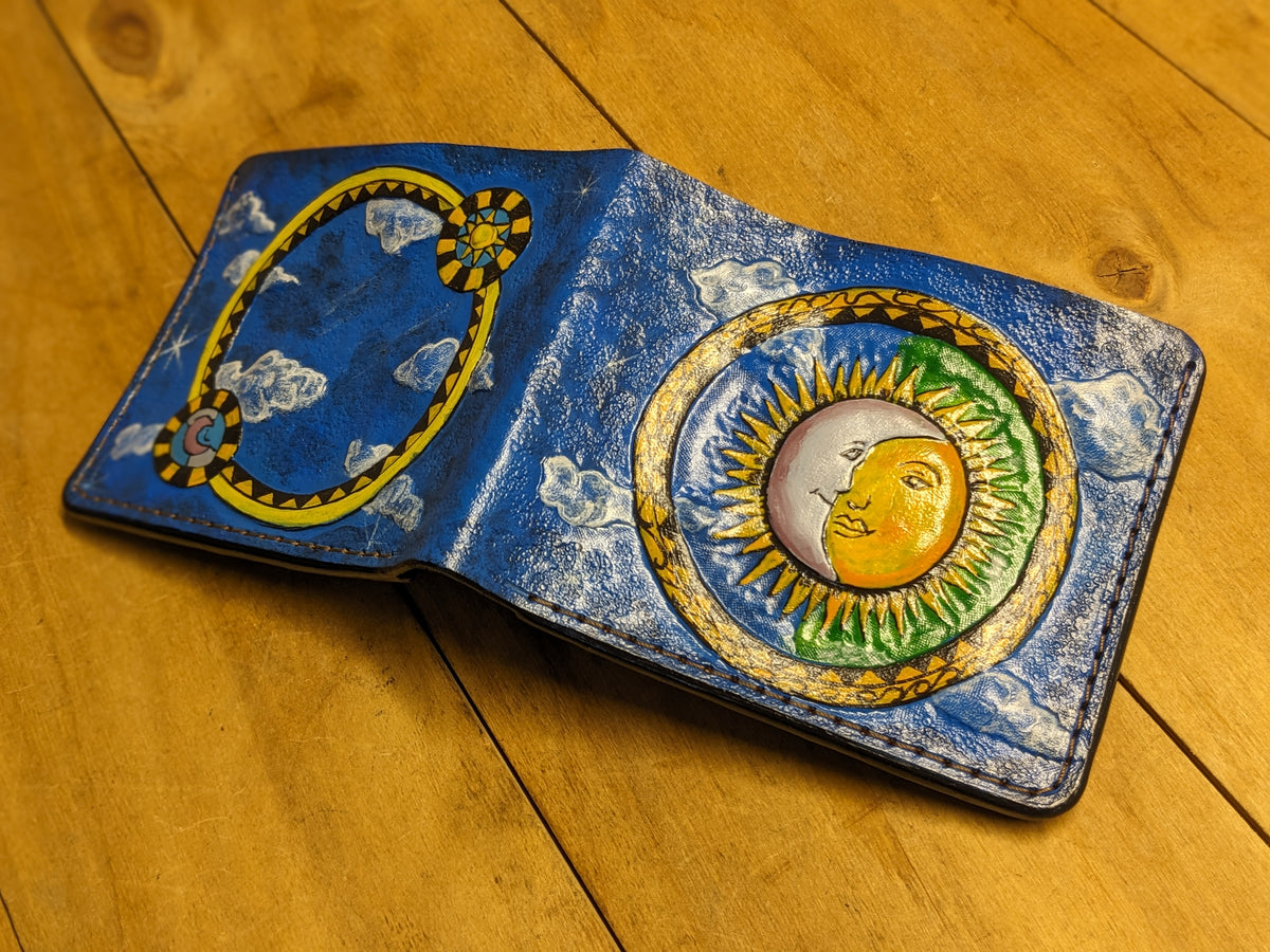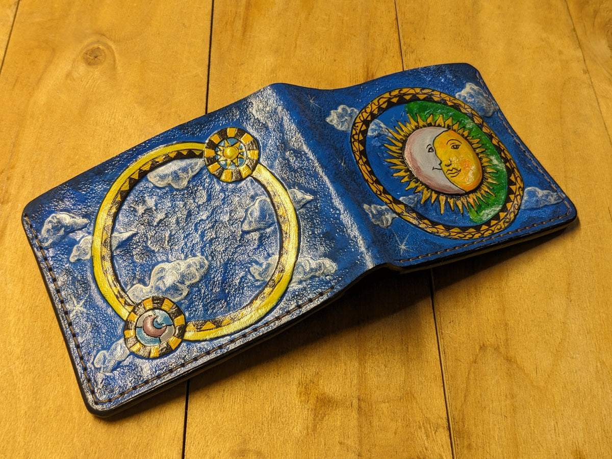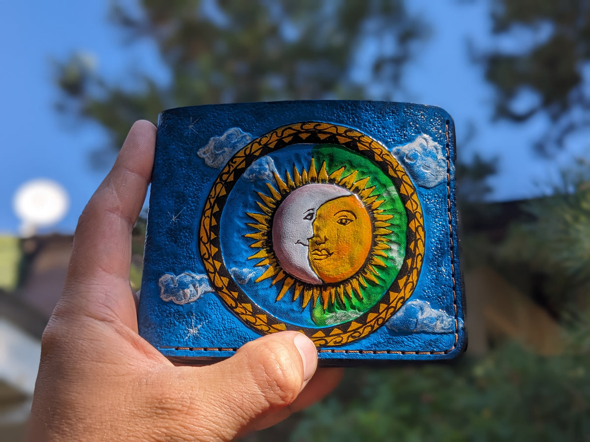 Embrace the beauty of time and the cosmos with this handmade leather bifold wallet, featuring an embossed sundial, sun and moon, and celestial elements. Crafted from premium full-grain leather, this unique wallet blends artistic design with durability and includes RFID protection to safeguard your cards. Perfect for astronomy lovers, night sky enthusiasts, and those drawn to the mystery of the galaxy, this wallet makes a meaningful gift for any occasion. Whether you're searching for moon-themed gifts, astronaut gifts, or a stylish accessory inspired by the stars, this wallet is a timeless choice.