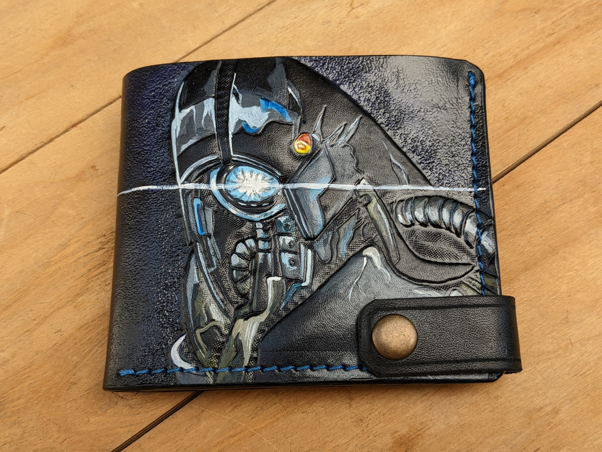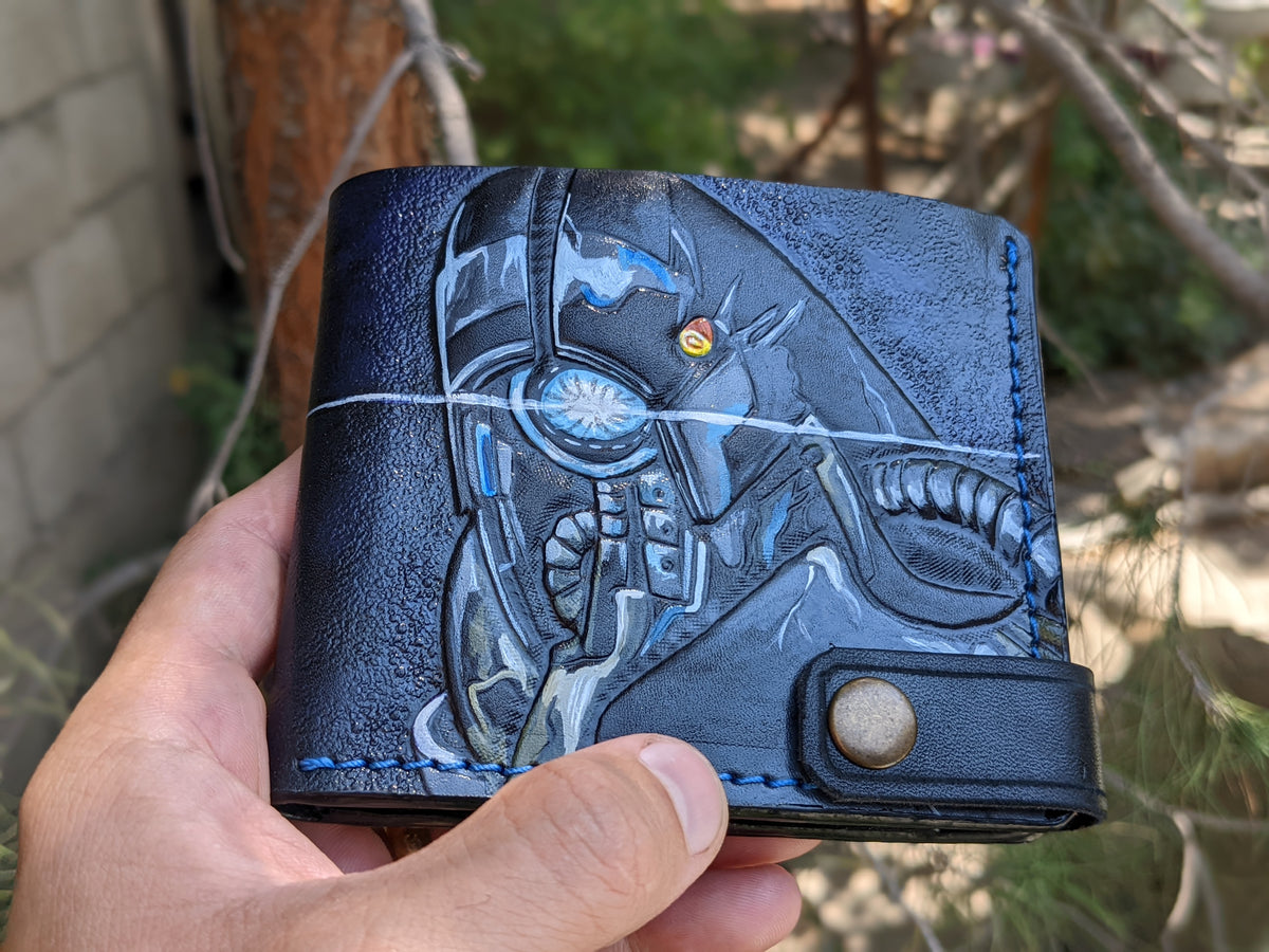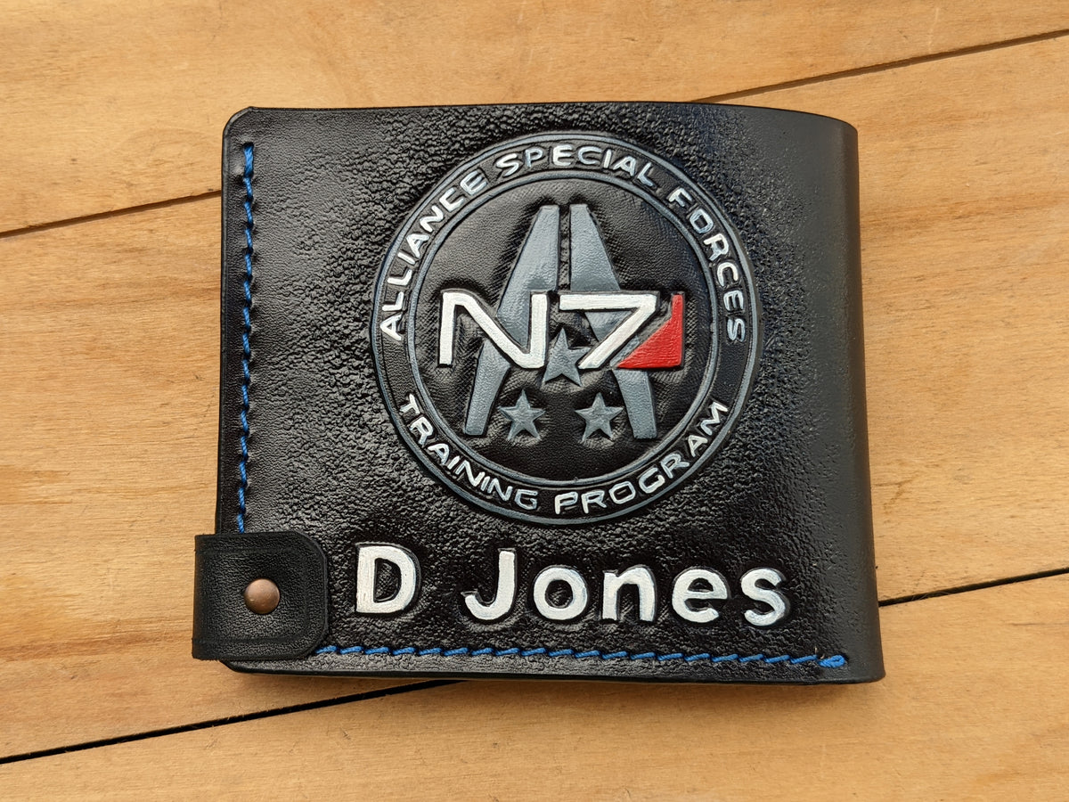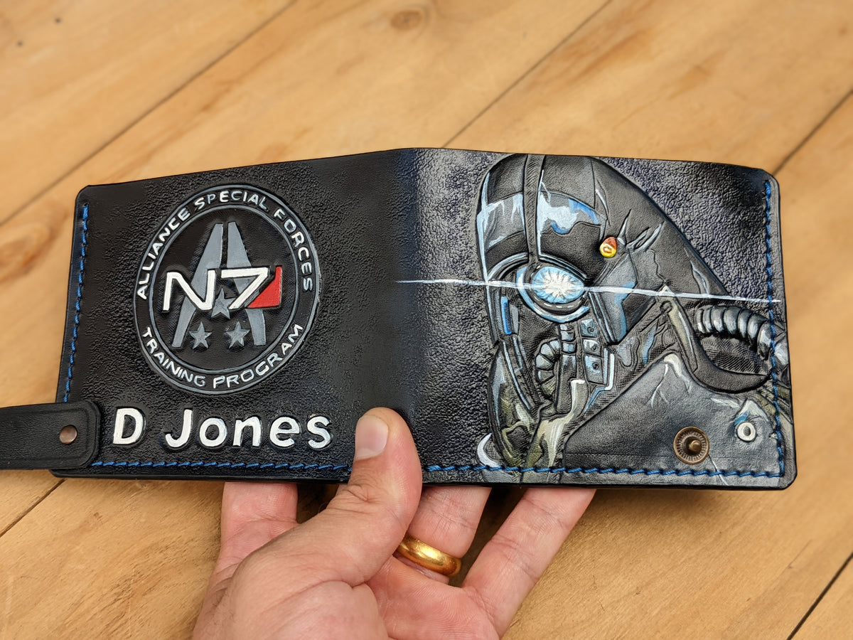 Explore the Mass Effect leather bifold wallet at Theodoros, crafted for fans of the epic sci-fi video game series. Handmade with genuine leather, this wallet features detailed embossing of Geth VI Legion, Commander Shepard, Garrus Vakarian, and the Alliance Special Forces logo. Its sleek, durable design combines functionality with artistry, making it the perfect accessory for everyday use or a collectible for passionate gamers. Whether you're shopping for a unique gift for him, a surprise for gamers, or the best present for a Mass Effect fan, this wallet is an ideal choice.
