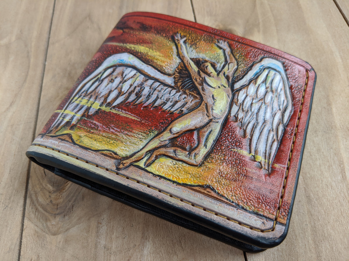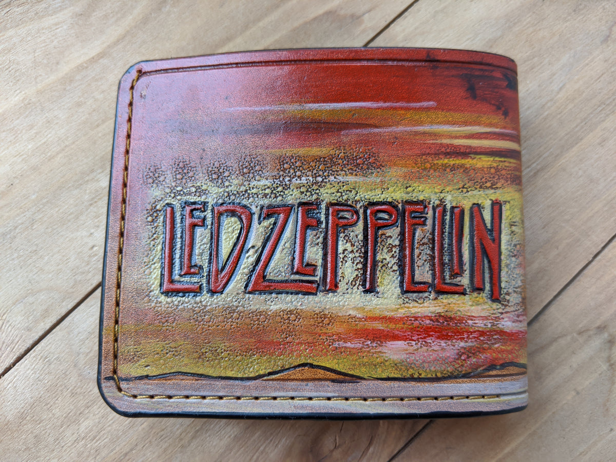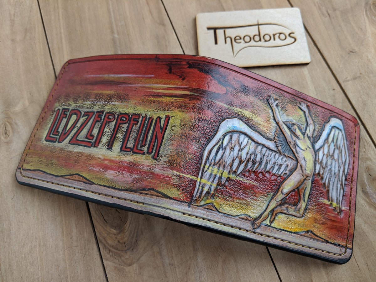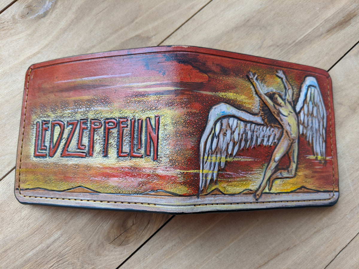 Celebrate the legacy of Led Zeppelin with this handcrafted leather bifold wallet, featuring an embossed Swan Song Angel design. Made from premium vegetable-tanned leather, this wallet is meticulously tooled, hand-painted, and built to last. Inspired by rock legends Jimmy Page, Robert Plant, John Paul Jones, and John Bonham, this RFID-protected wallet is perfect for fans of folk rock, blues rock, and hard rock. A must-have for collectors, music lovers, and those looking for the perfect Led Zeppelin-themed gift.