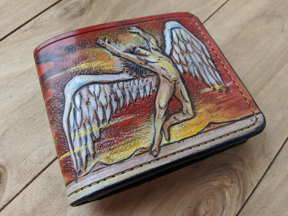 Our exquisite handmade Genuine leather wallet, crafted from high-quality Full Grain Vegetable Tanned Leather. This unique wallet features stunning hand-tooled and hand-painted designs, making it a true work of art.