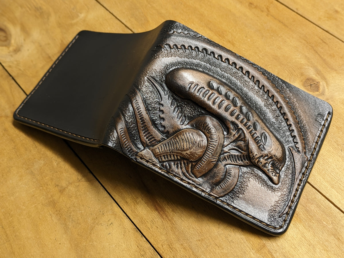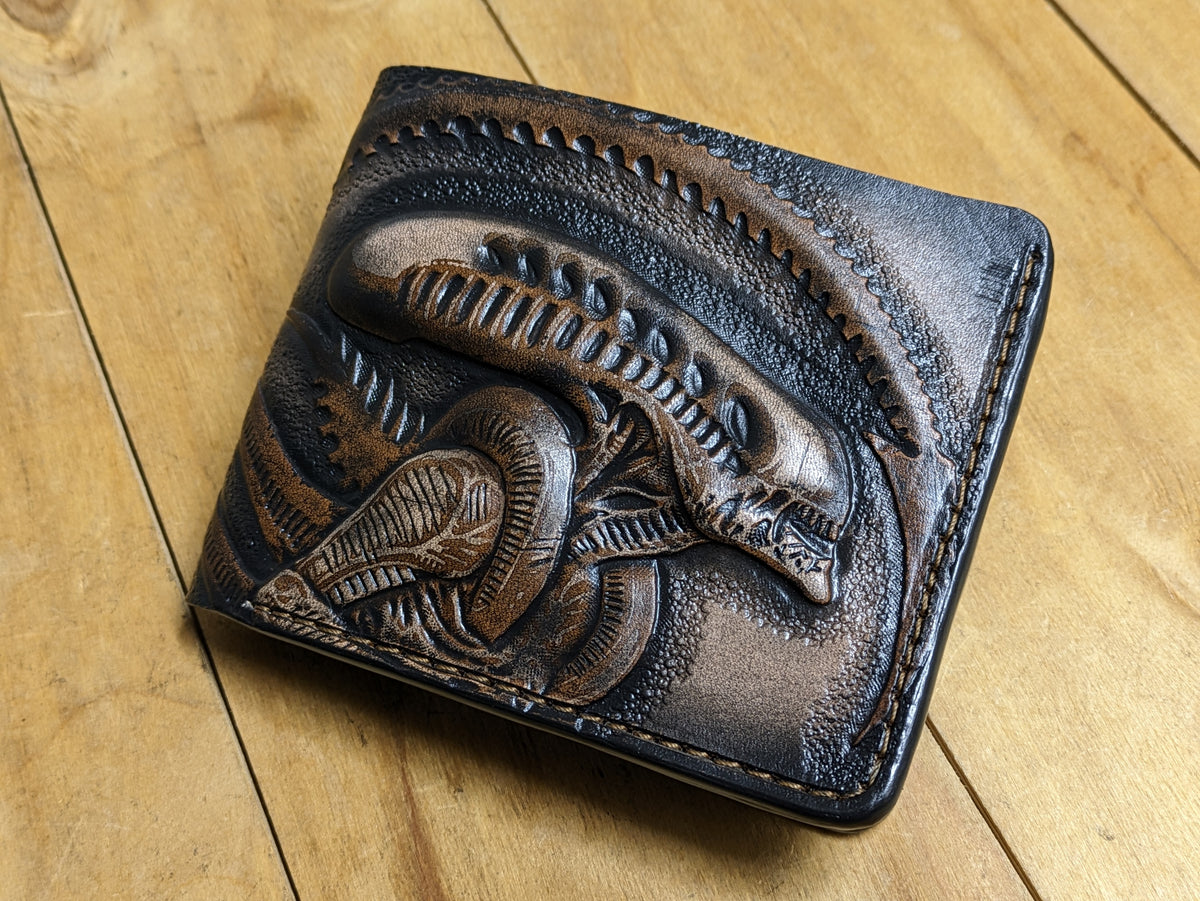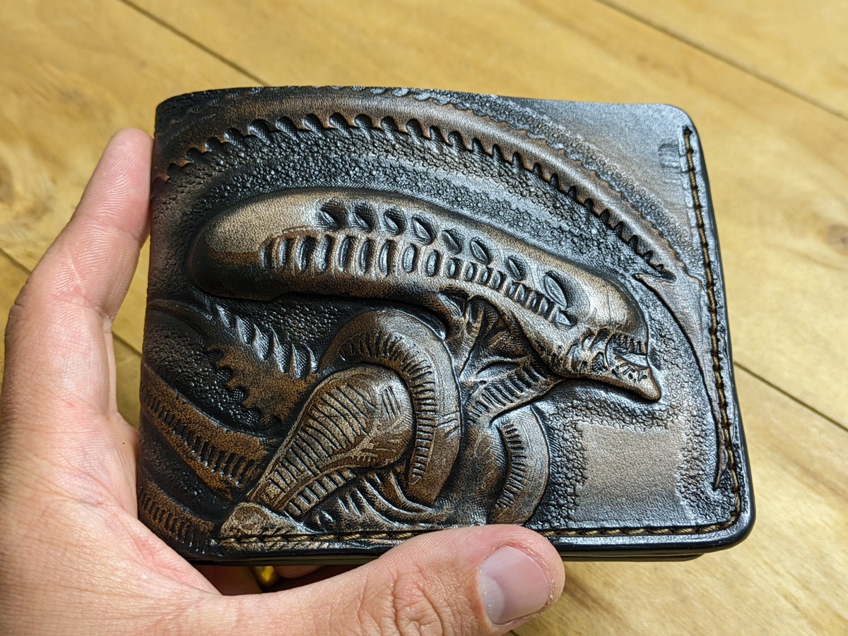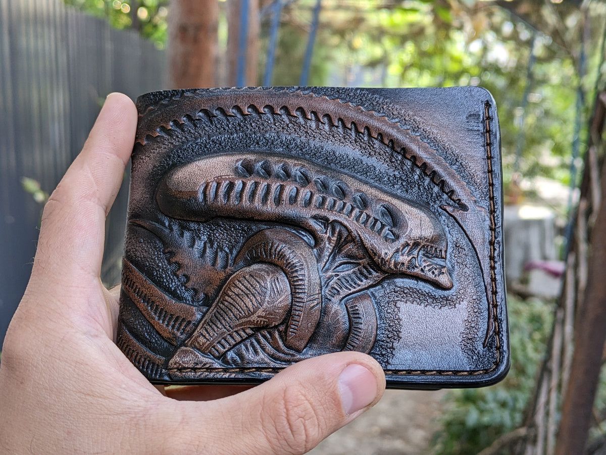 Handmade Alien vs. Predator bifold leather wallet featuring an embossed Xenomorph and Predator design. Crafted from high-quality leather with RFID protection, this wallet is perfect for fans of Ridley Scott movies, Ellen Ripley, and sci-fi horror classics. Whether you're a collector, a biker, or just a lover of unique accessories, this wallet makes an excellent gift for movie lovers, Alien and Predator fans, or anyone who appreciates handcrafted leatherwork.