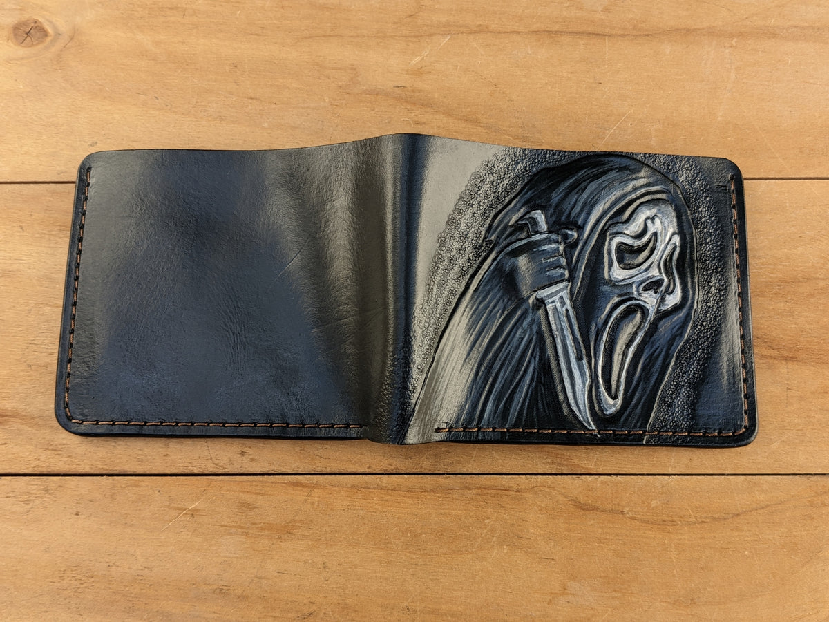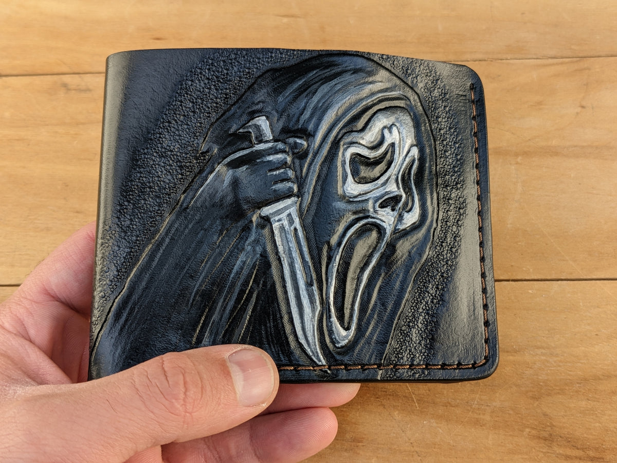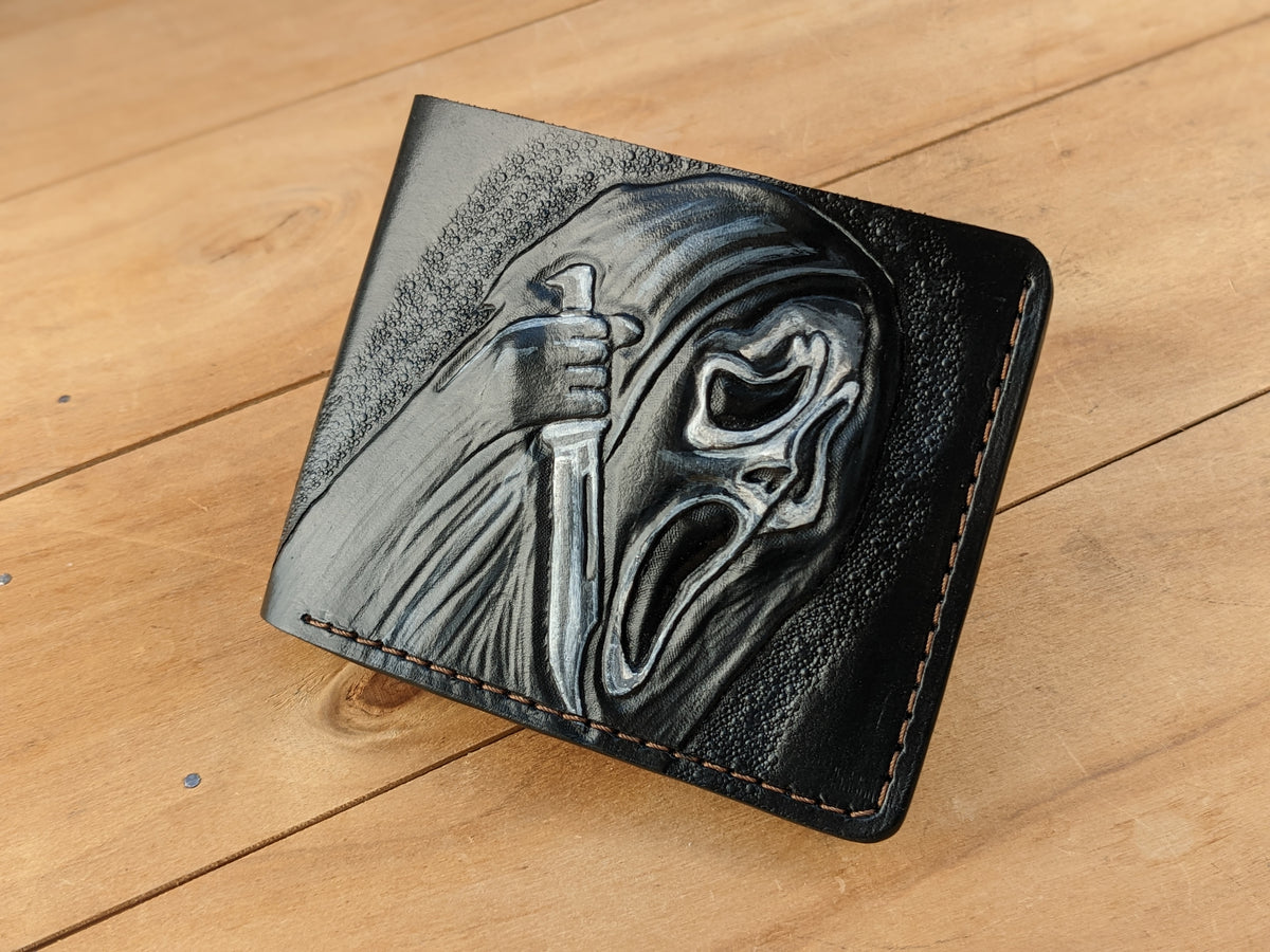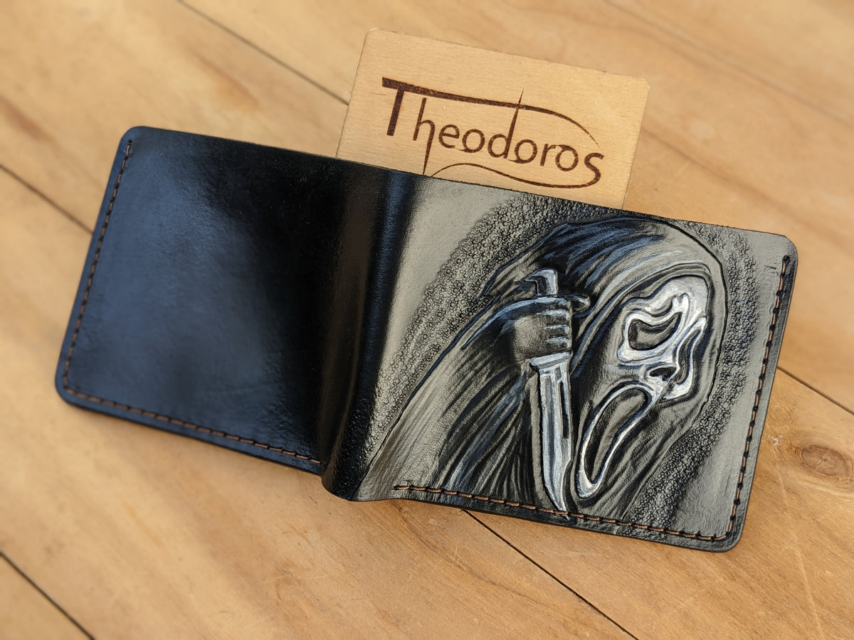 Handmade bifold leather wallet featuring an embossed Ghostface mask design from the iconic Scream franchise. Crafted from premium leather with RFID protection, this wallet is the perfect blend of style and horror movie nostalgia. Ideal for fans of classic slasher films, horror lovers, and collectors, it makes a great gift for boyfriends, movie buffs, and anyone who appreciates Scream and Ghostface. A must-have accessory for horror enthusiasts who love unique and handcrafted designs.