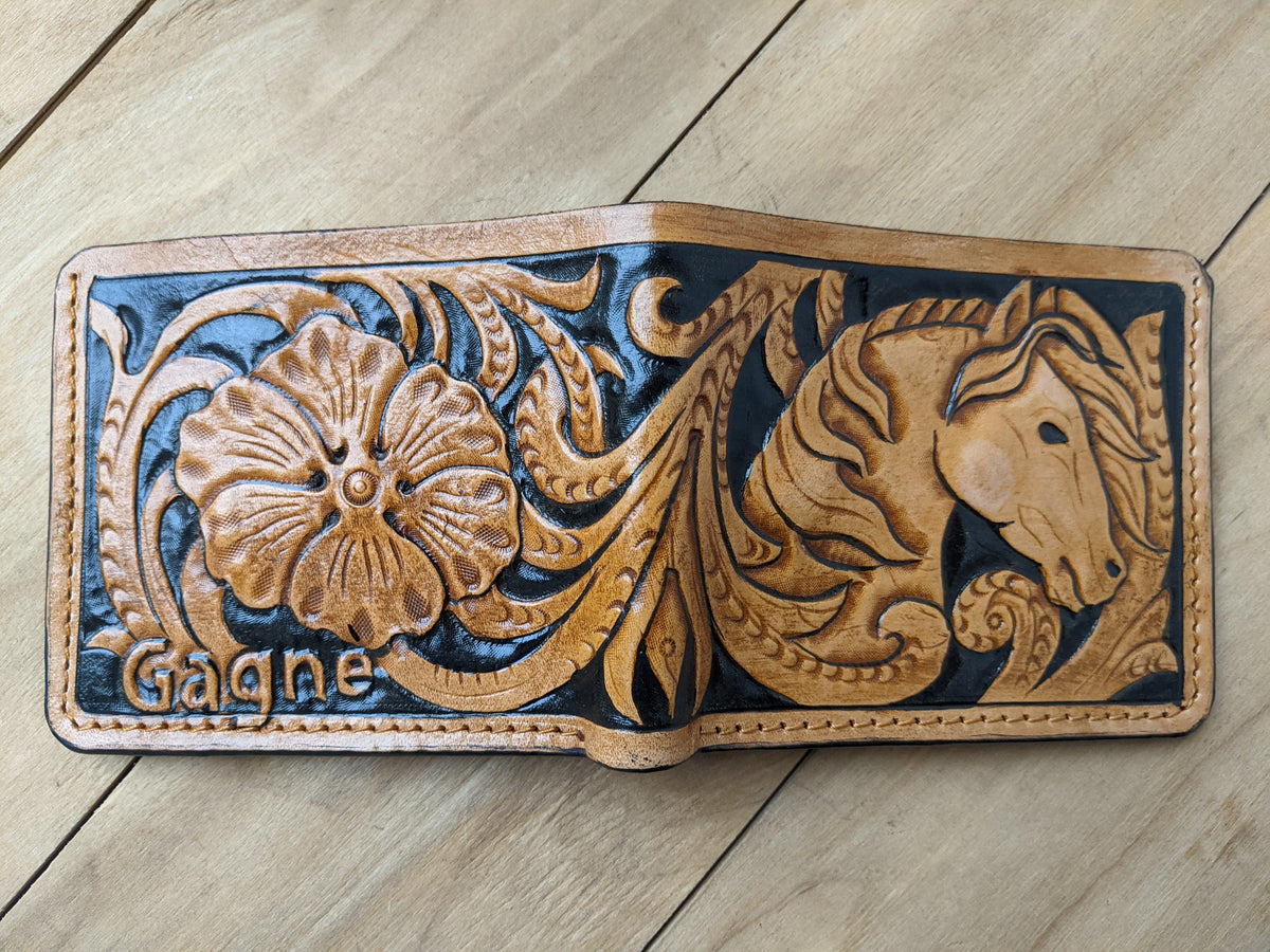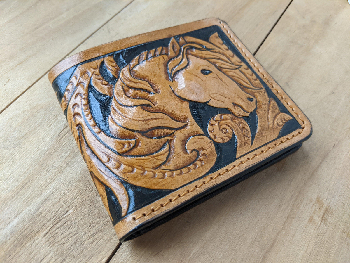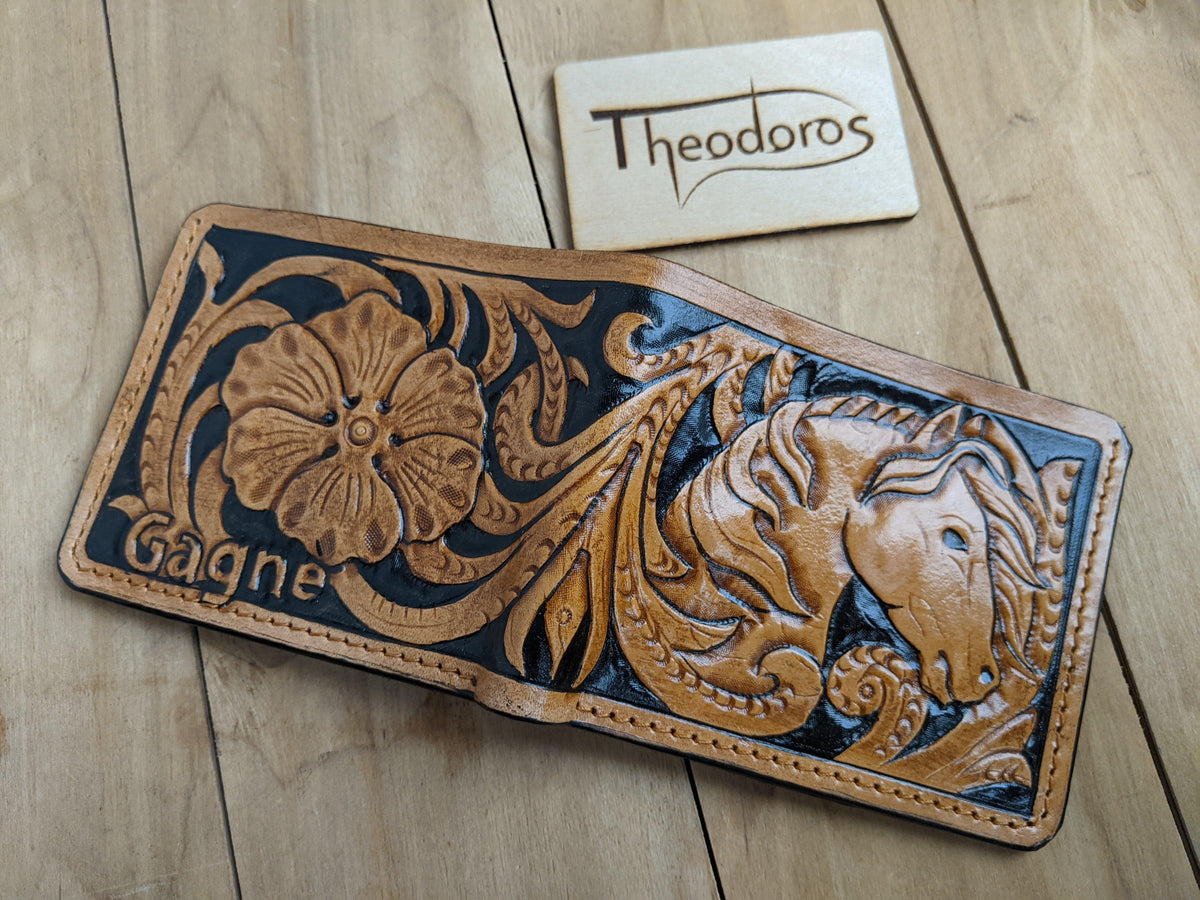 Capture the spirit of the Wild West with this handmade bifold leather wallet, featuring an intricately embossed Mustang horse in classic Sheridan floral style. Crafted for cowboy souls and Western lovers, this RFID-protected wallet is both rugged and elegant. Its vintage Western design and artisan craftsmanship make it a standout gift for him—ideal for horse lovers, ranchers, and fans of Western heritage.