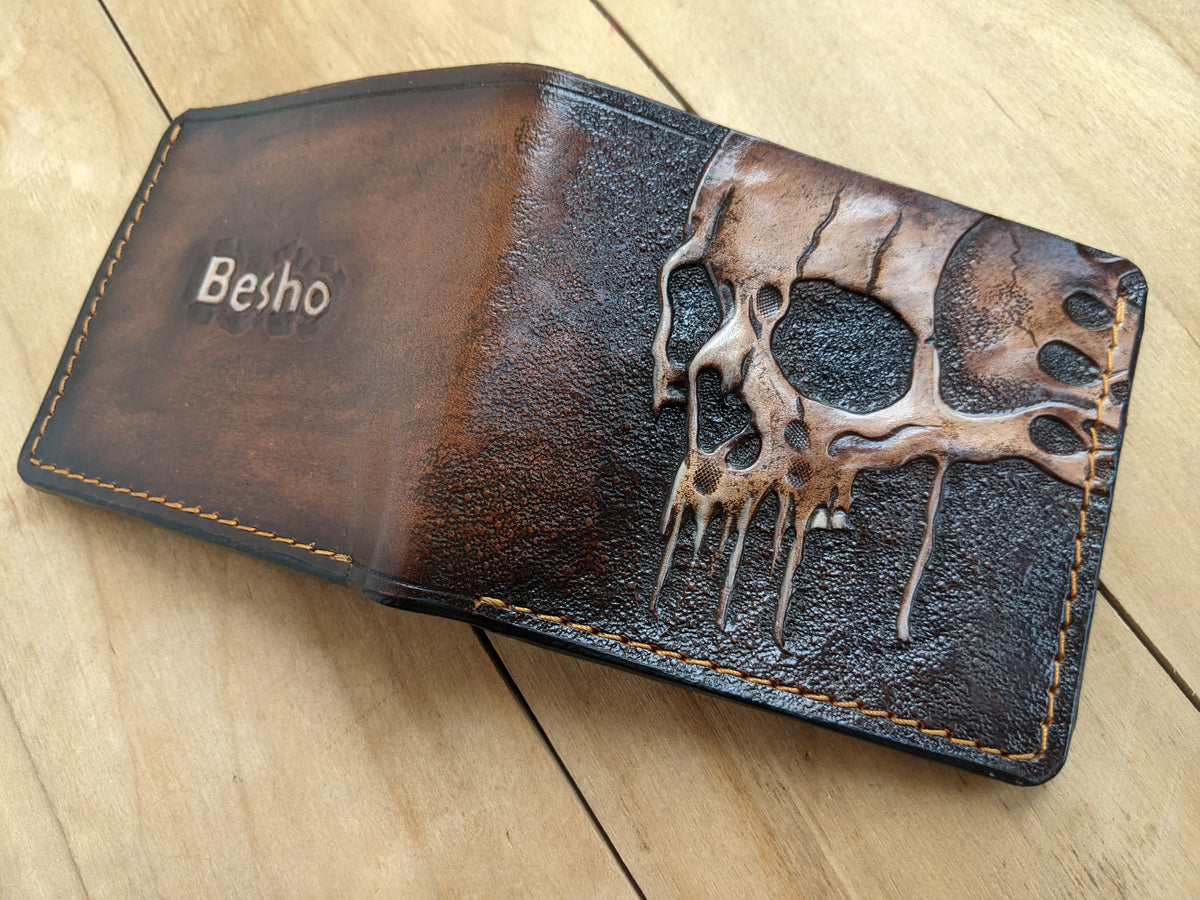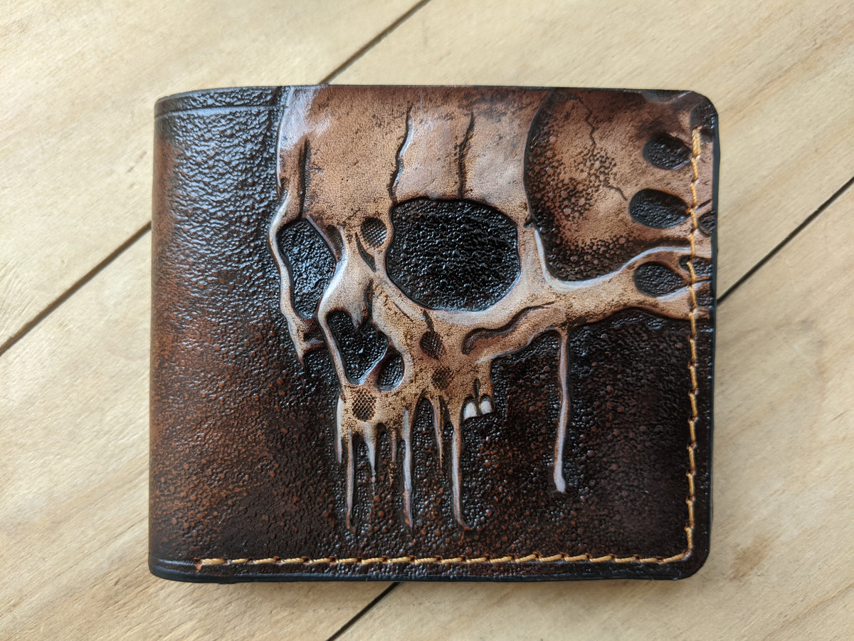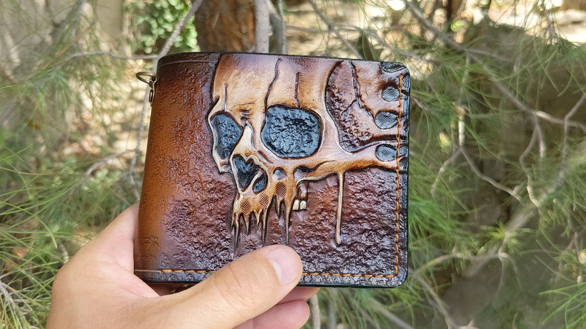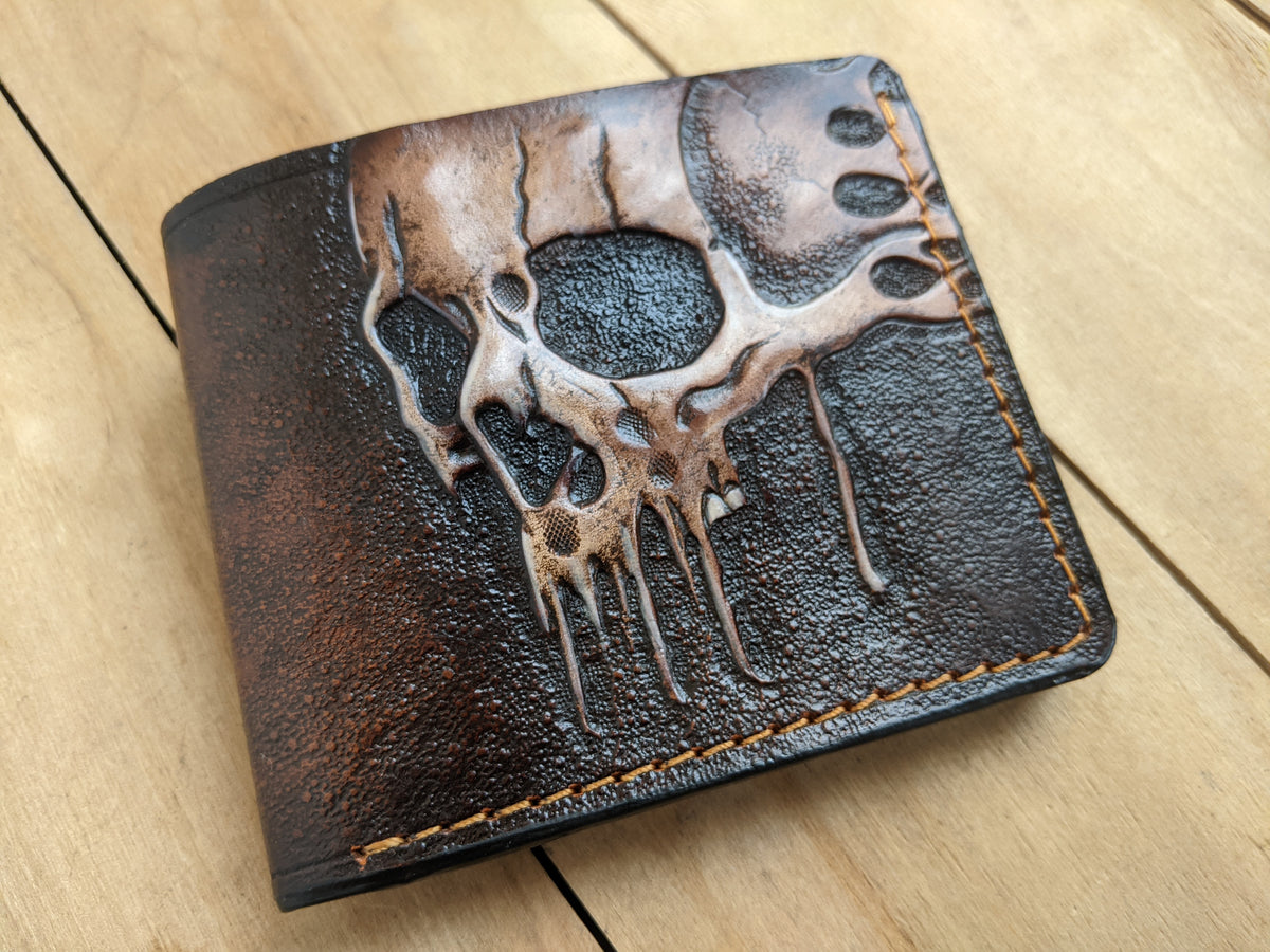 Handmade horror-themed leather wallet, featuring a chilling embossed design of a melting zombie skull and skeletal elements. Perfect for fans and gothic style, this bifold wallet combines gruesome detail with rugged craftsmanship. Made from genuine leather, it’s a bold statement piece and an unforgettable gift for horror lovers, collectors, and those with a taste for the undead.
