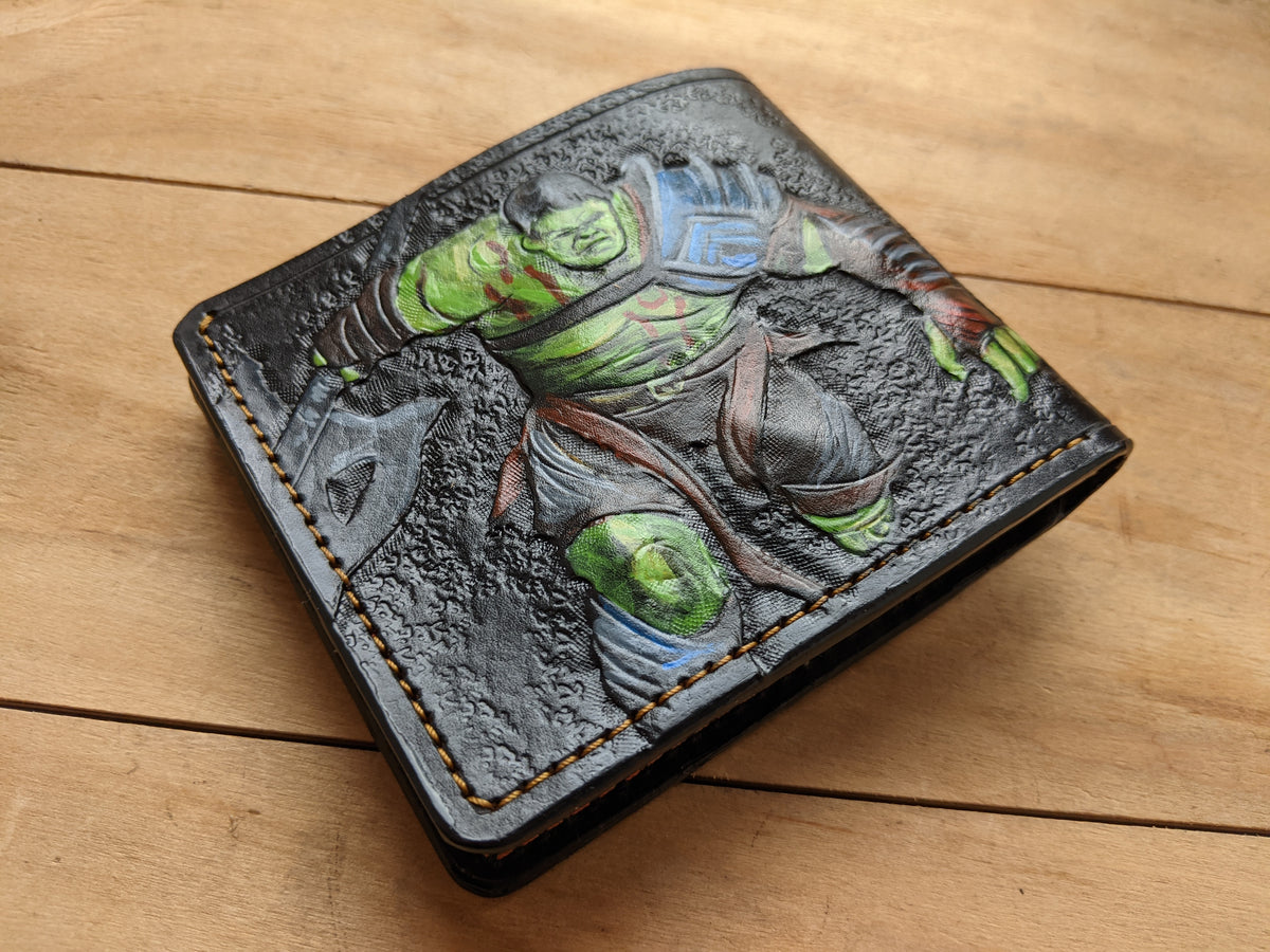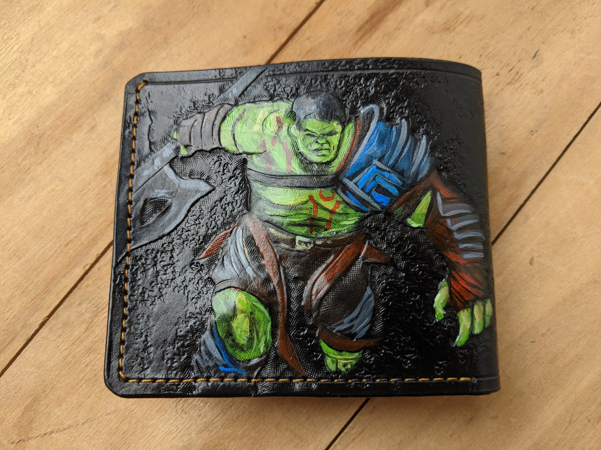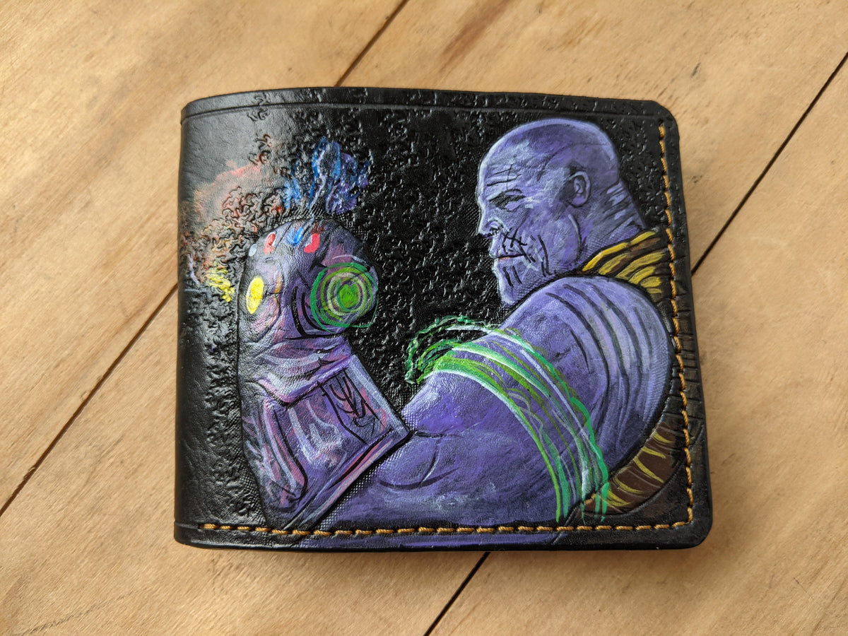 Handmade leather wallet featuring an embossed Thanos Infinity Gauntlet with glowing Infinity Stones, alongside Hulk and comic-style cosmic detailing. Inspired by Marvel’s epic battles, this bold bifold captures the power of the universe in your pocket. Crafted from genuine leather with heroic embossing, it’s the perfect accessory for Marvel fans, comic collectors, and lovers of powerful design. An epic gift for those who admire strength, balance, and the saga of the Infinity War.
