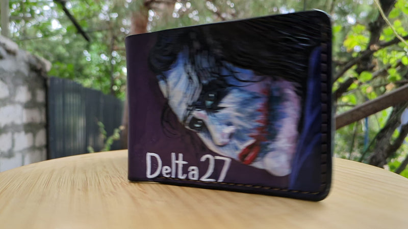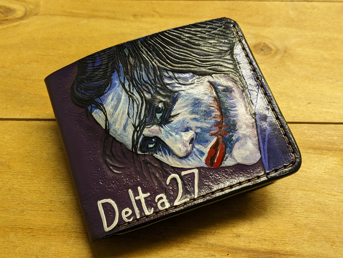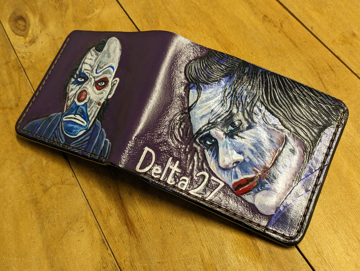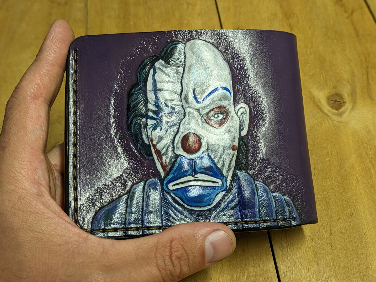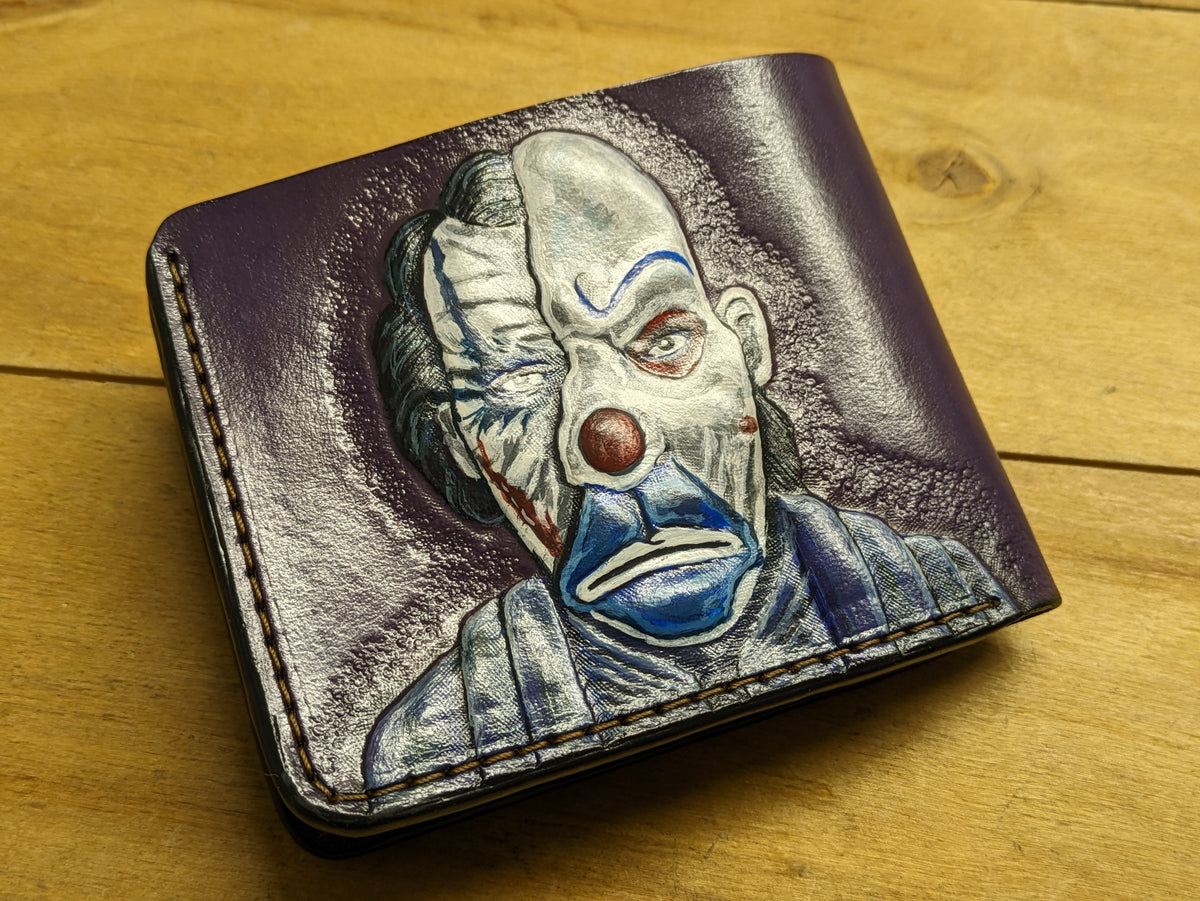 Handmade leather wallet featuring an embossed design of the Joker in his bank robbery clown mask, inspired by Heath Ledger’s iconic role in The Dark Knight. This bold bifold captures the chilling opening scene that redefined the Joker as a master of chaos and deception. Crafted from genuine leather with cinematic detail, it's a perfect gift for DC fans, movie collectors, and admirers of one of film’s most unforgettable villains.