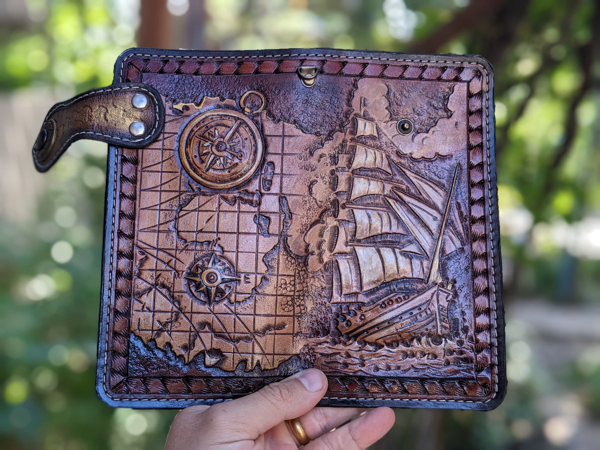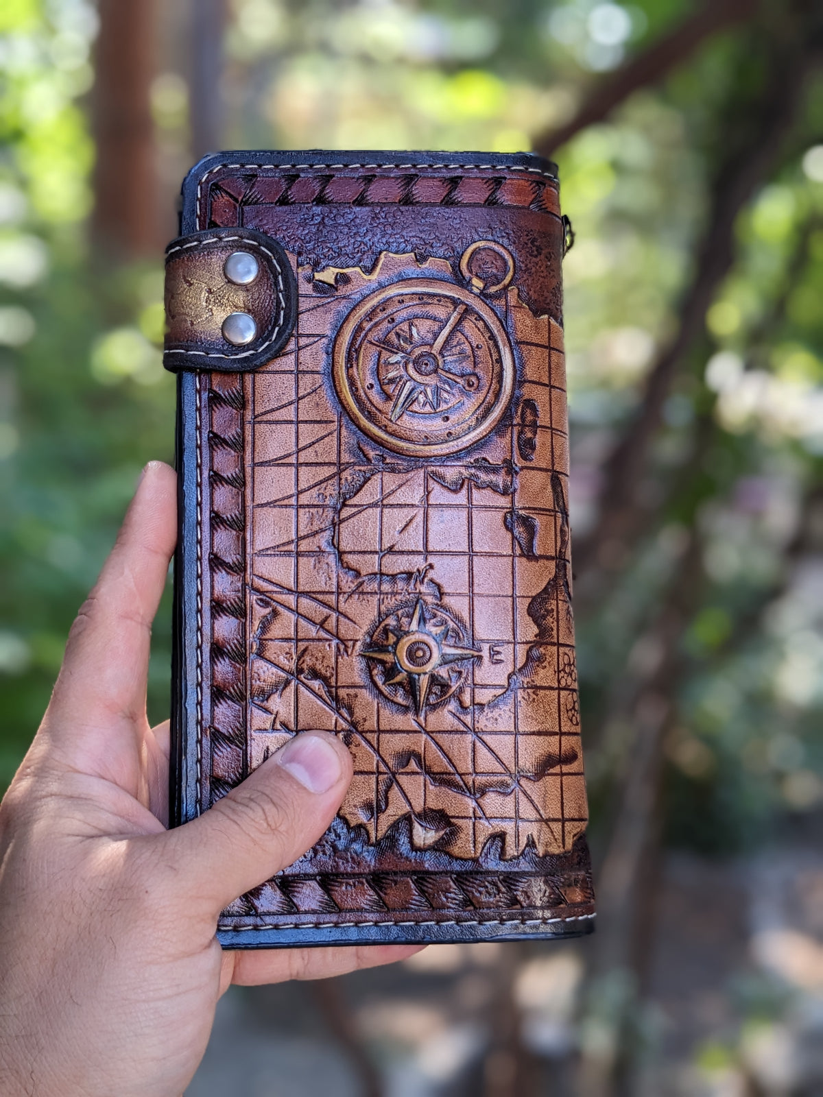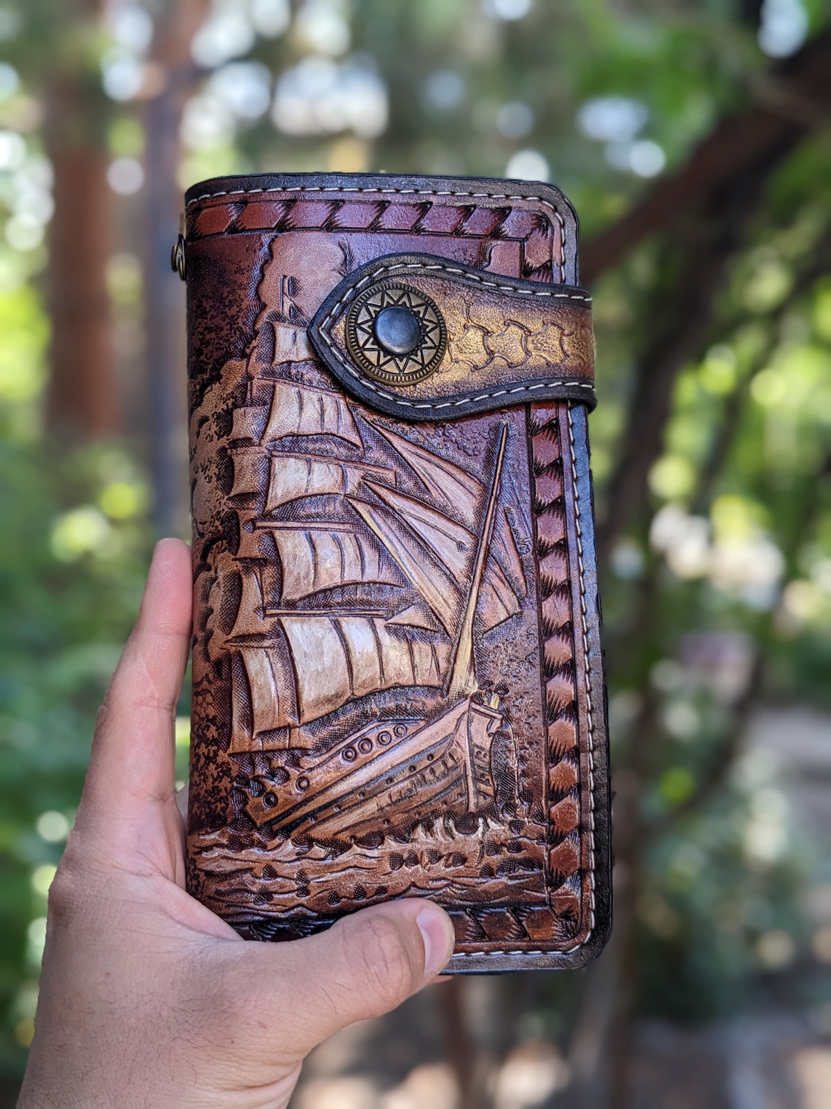 Handmade long leather travel wallet featuring an embossed design of a majestic frigate ship, vintage treasure map, and detailed compass rose. Inspired by age-old maritime adventures and pirate lore, this genuine leather clutch is perfect for explorers at heart. Whether you're a sailor, history lover, or seeker of hidden treasures, this wallet captures the spirit of the open sea and old-world navigation. A perfect gift for adventurers and nautical enthusiasts.