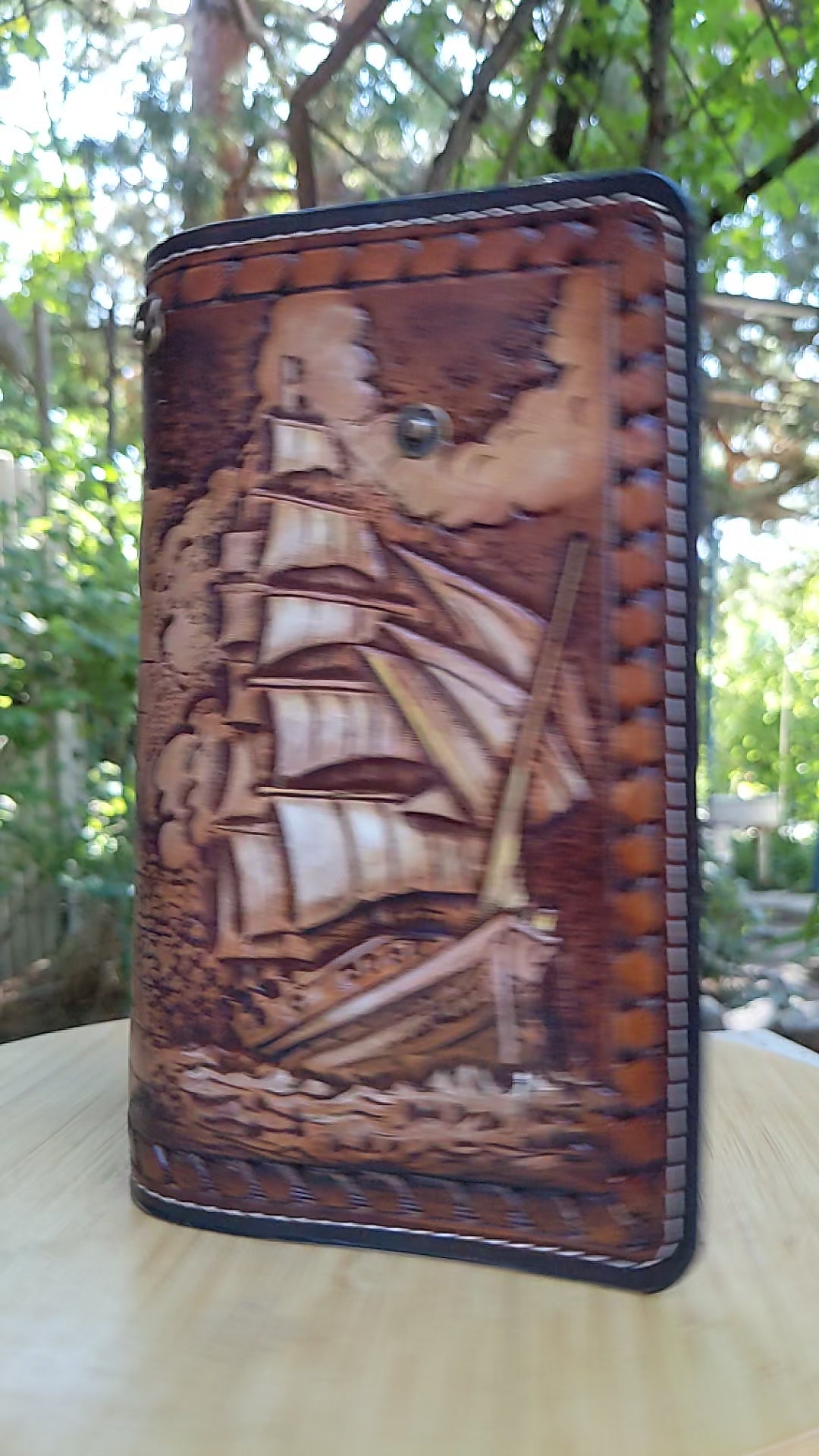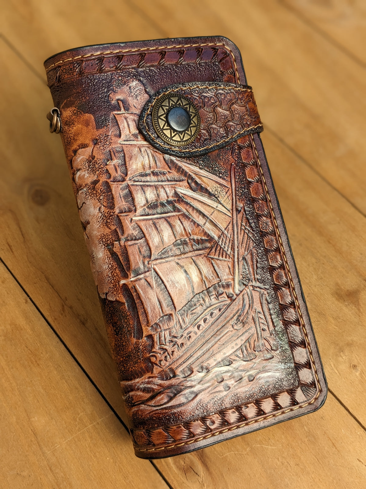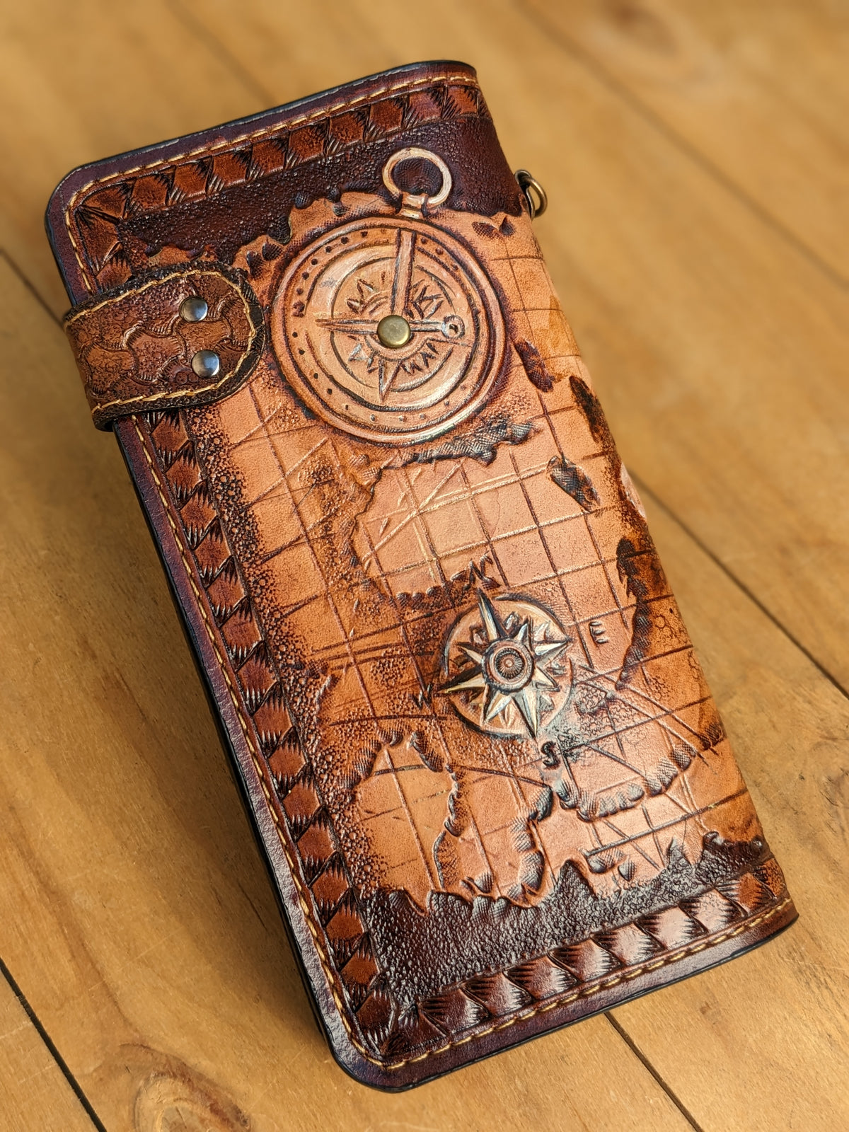 Handmade long leather travel wallet featuring an embossed design of a majestic frigate ship, vintage treasure map, and detailed compass rose. Inspired by age-old maritime adventures and pirate lore, this genuine leather clutch is perfect for explorers at heart. Whether you're a sailor, history lover, or seeker of hidden treasures, this wallet captures the spirit of the open sea and old-world navigation. A perfect gift for adventurers and nautical enthusiasts.