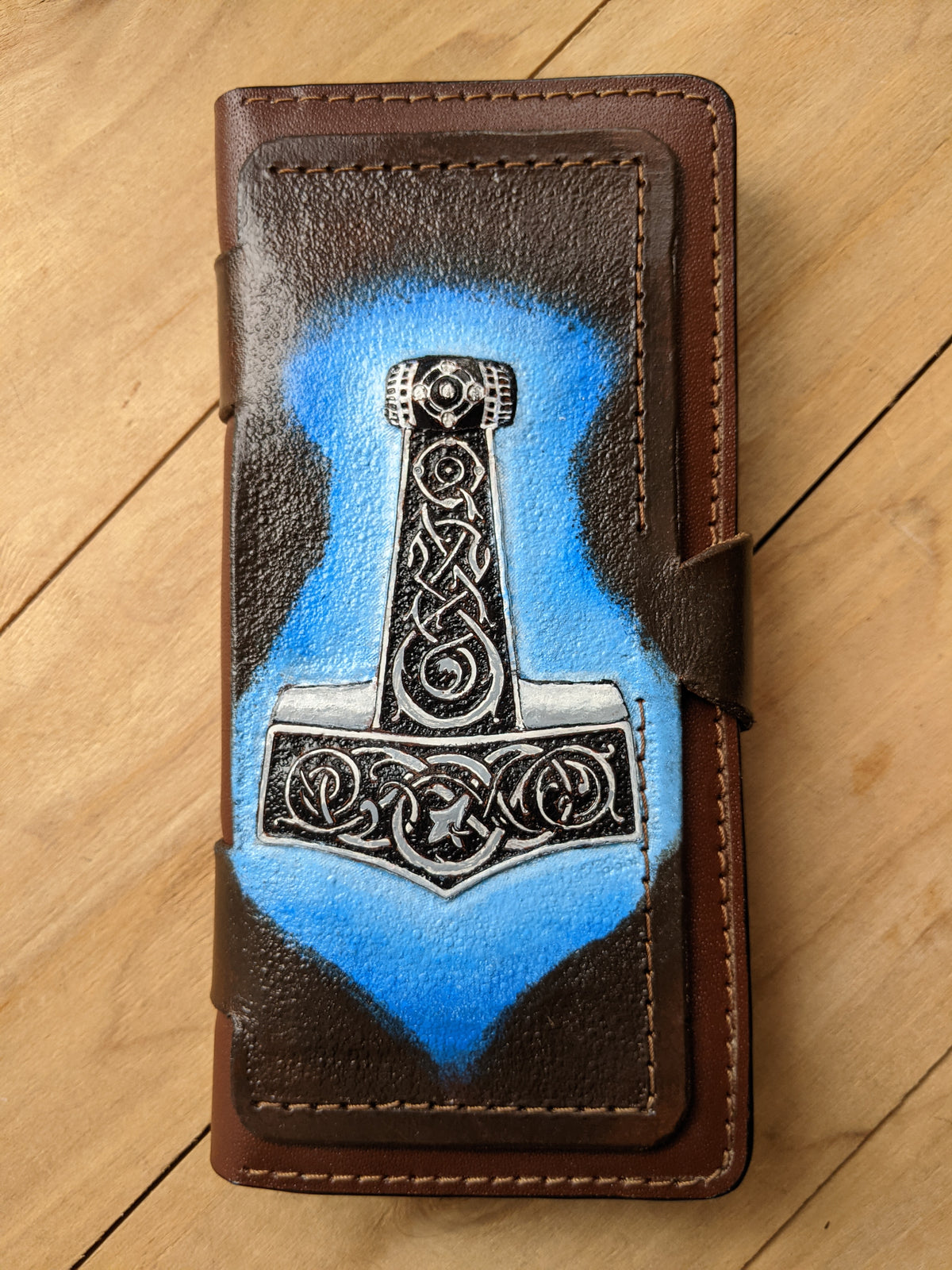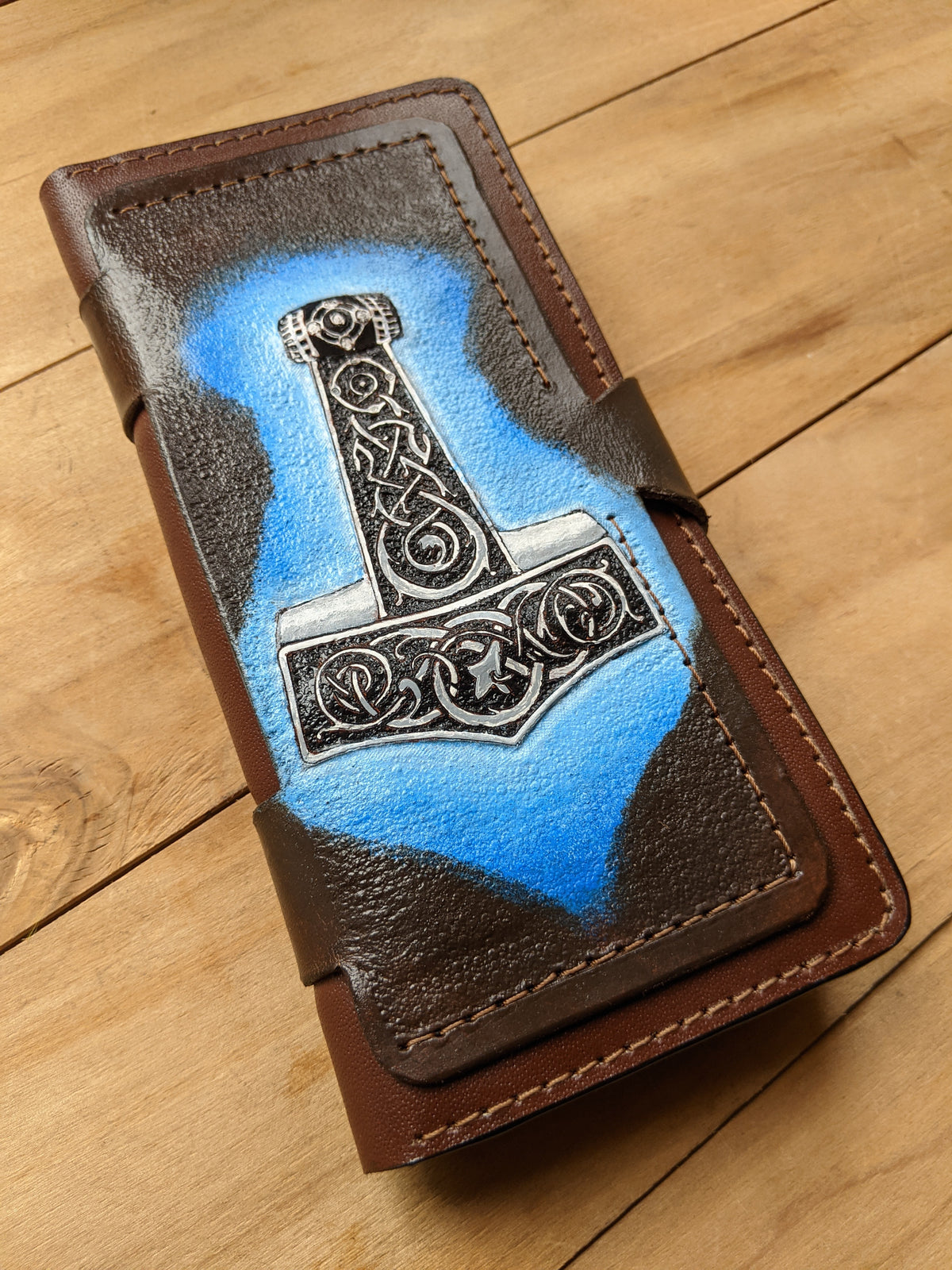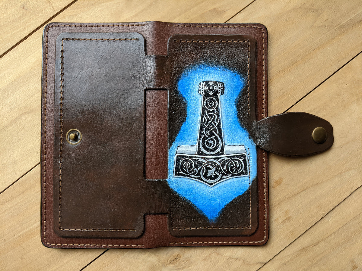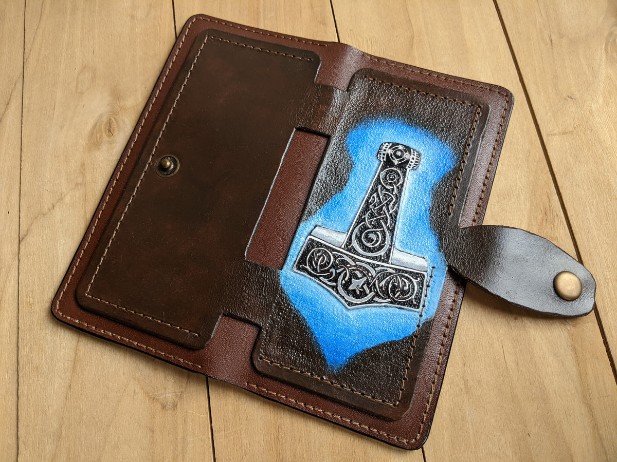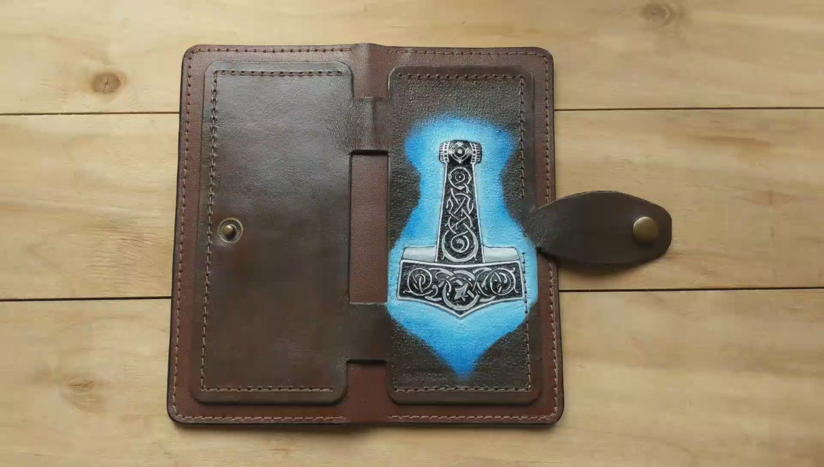 Handmade long leather biker wallet featuring an embossed Thor’s Hammer (Mjolnir) adorned with intricate Celtic knotwork—a powerful symbol of protection, thunder, and Norse strength. Crafted from genuine leather, this travel clutch wallet fuses Viking mythology with ancient Celtic artistry, making it a bold accessory for modern warriors. An ideal gift for fans of Norse gods, pagan heritage, and timeless symbolic design.