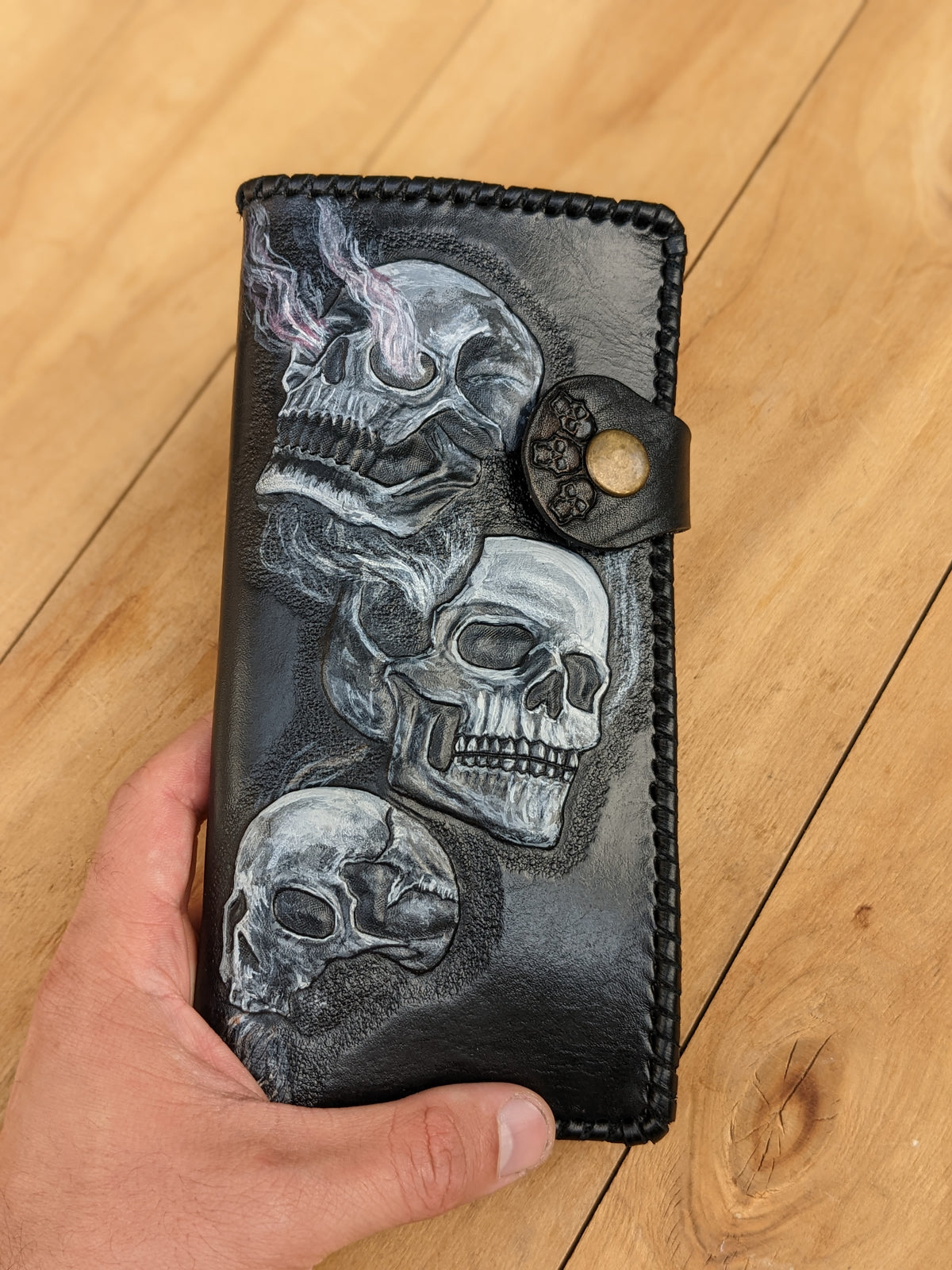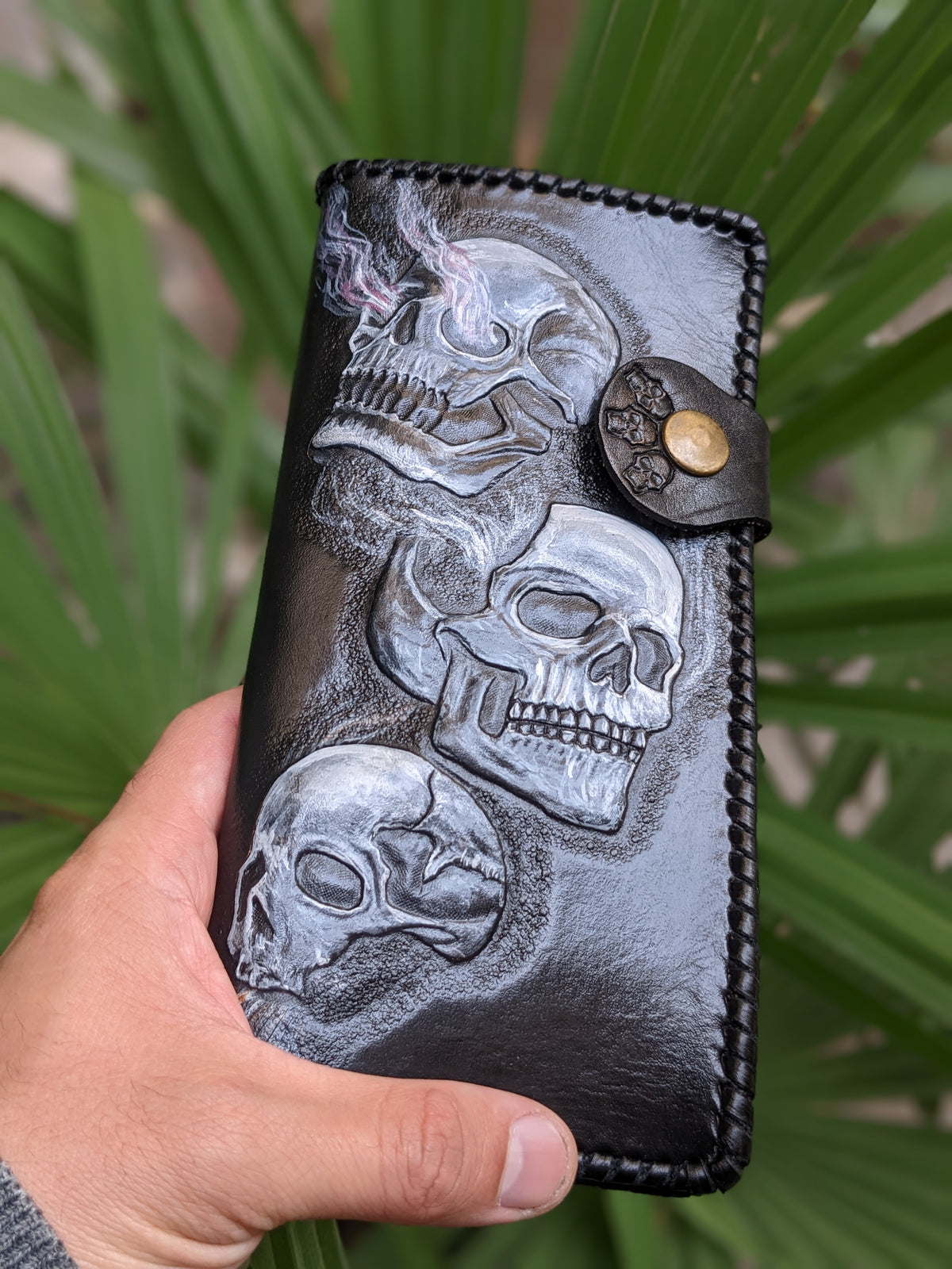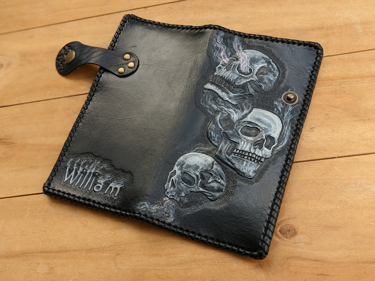 Handmade long leather biker wallet featuring an intense embossed design of three flaming smoking skulls and fiery skeletons engulfed in blaze. Crafted from genuine leather, this travel clutch wallet radiates rebellion, danger, and raw biker attitude. A perfect gift for fans of heavy metal, fire-themed skull art, and those who live fast and fearless. Bold, gritty, and unapologetically fierce—just like the ride.