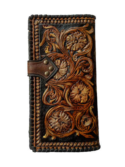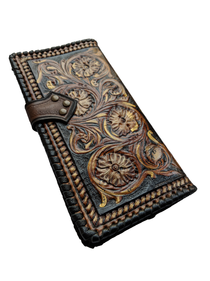 Handmade long leather biker wallet featuring an embossed Western rodeo cowboy on horseback surrounded by elegant Boho floral Sheridan-style patterns. Crafted from genuine leather, this travel clutch wallet blends rugged Western tradition with artistic floral detail. A perfect gift for rodeo fans, horse lovers, cowgirls, cowboys, and those who appreciate Bohemian Western charm.