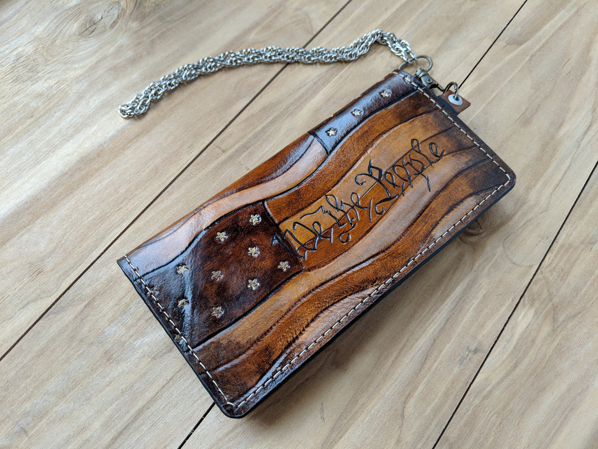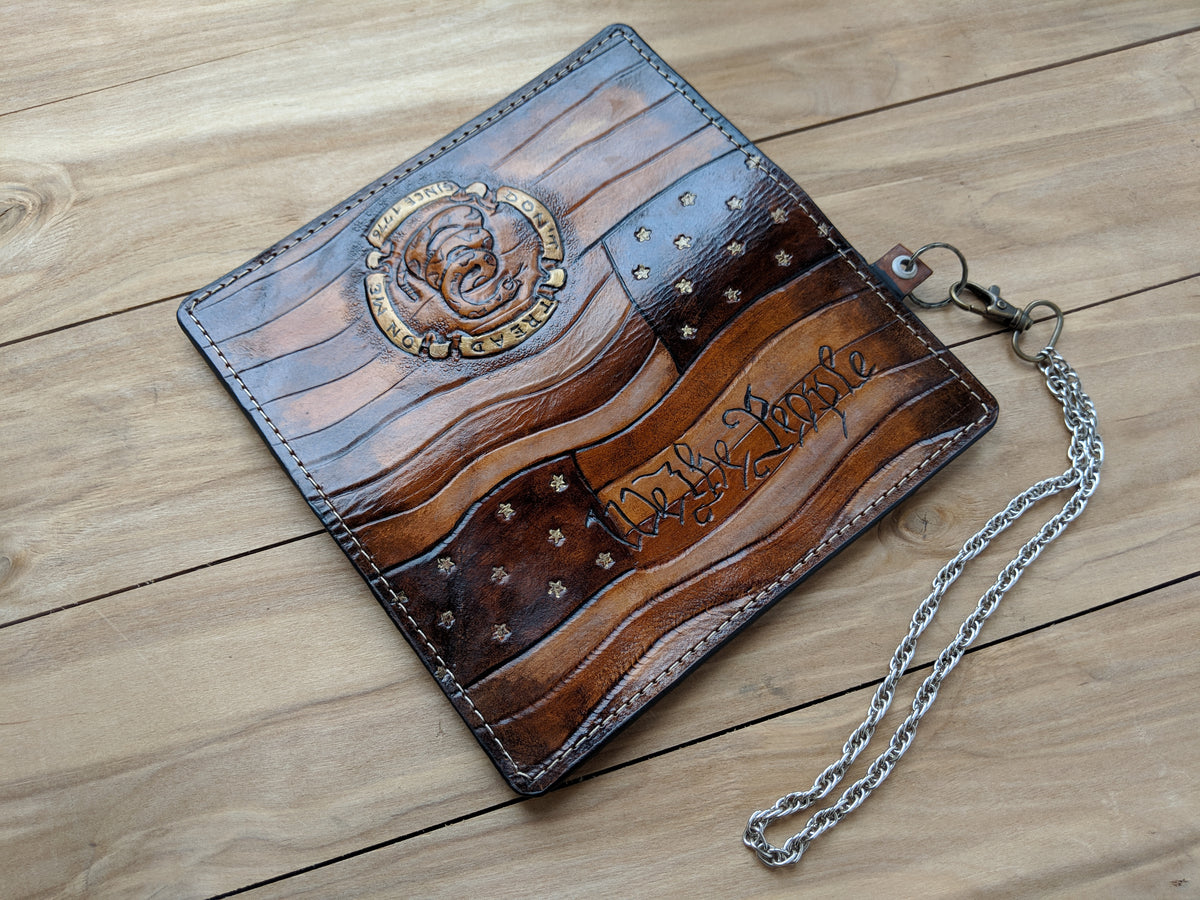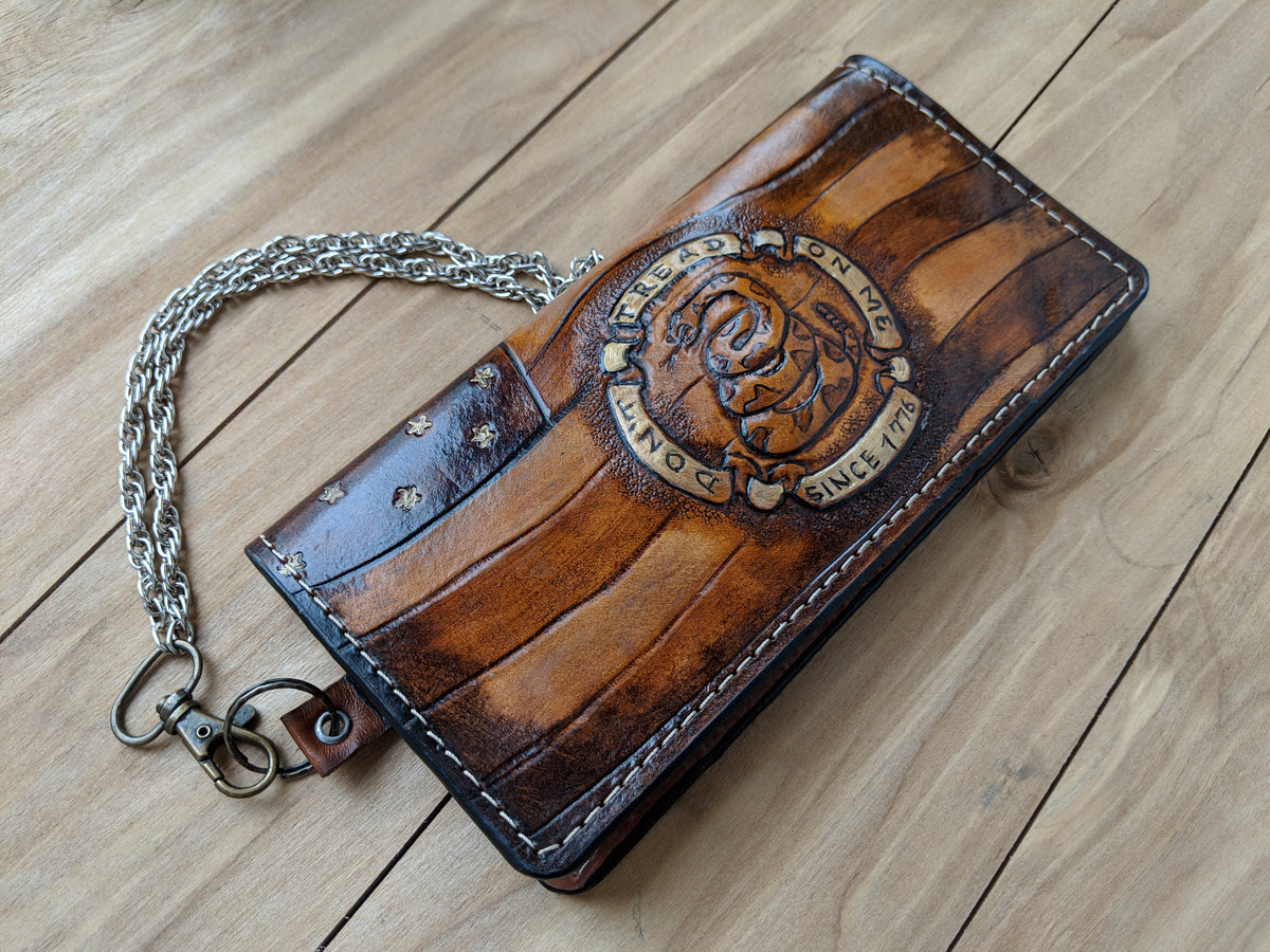 Handmade long leather biker wallet featuring iconic American patriotic symbols: the Gadsden Flag “Don’t Tread On Me” snake, We the People script from the Constitution, and Join or Die rattlesnake emblem. Crafted from genuine leather, this bold travel clutch wallet celebrates freedom, independence, and American heritage. A powerful gift for veterans, patriots, bikers, and fans of U.S. history and the Constitution.